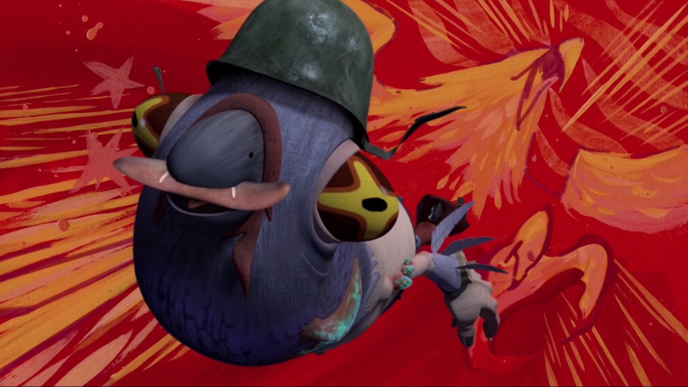 Soudain, du pain était jeté au visage de l’un des robots. Un pigeon fendait les airs pour l’atteindre et faisait tomber l’extraterrestre au sol. Il s’agissait de Pigeon Pete. Les kraangs n’avaient pas le temps de comprendre ce qu’il se passait. Le mutant était bientôt rejoint par Leatherhead, Slash et Monkey Brains. L’alligator et la tortue géante déchiquetaient les robots, tandis que le singe manipulait les esprits des envahisseurs pour les faire se tirer dessus. En quelques secondes, l’armée était détruite.