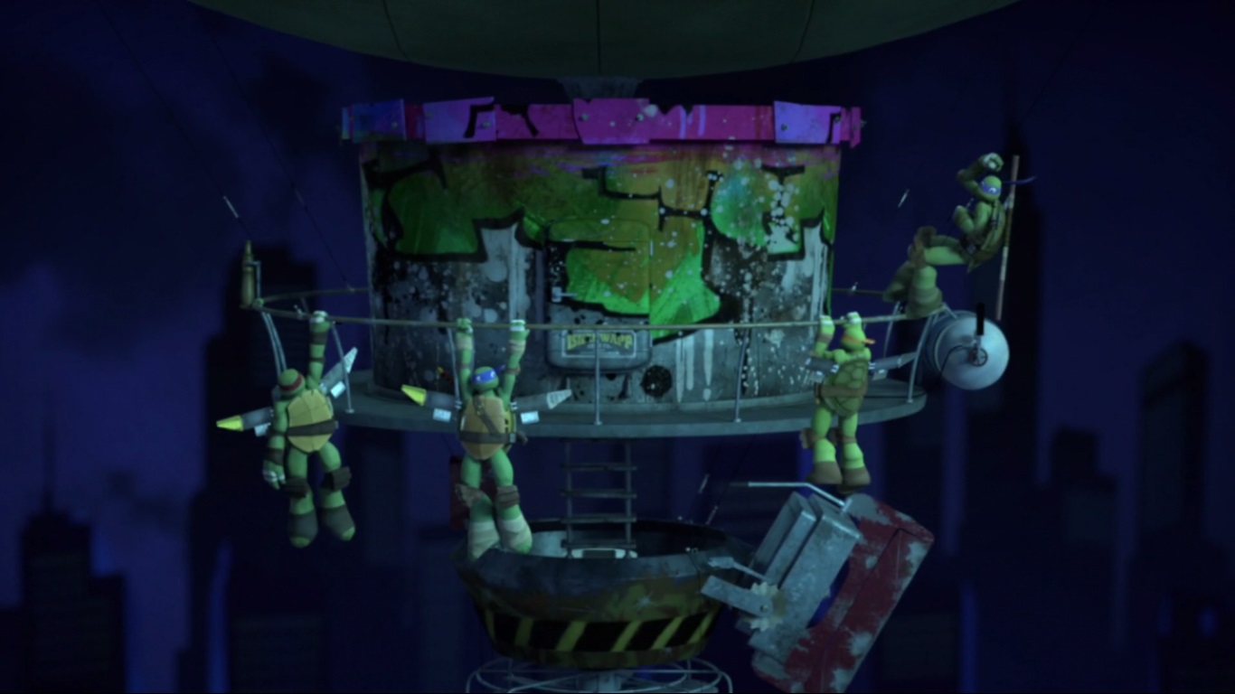 Le Dr. Rockwell et Donatello réfléchissaient au meilleur plan d’attaque, non sans se chamailler une fois de plus. Les Mutanimals n’avaient pas l’intention de faire équipe, et préféraient choisir une offensive terrestre. Les tortues préféraient un plan d’attaque depuis les airs, bien que Raphael jugeait préférable de combiner les deux tactique. Voyant la moitié de l’équipe partir, Donatello retenait ses frères pour leur présenter sa fameuse invention. Elle devrait leur être d’une très grande aide. Les ninjas se rendaient sur le toit, face au fameux château d’eau. Là, Donatello activait un levier qui ouvrait la structure de bois pour laisser apparaître un gigantesque ballon autogonflant. Il s’agissait d’un dirigeable, le Turtle blimp !