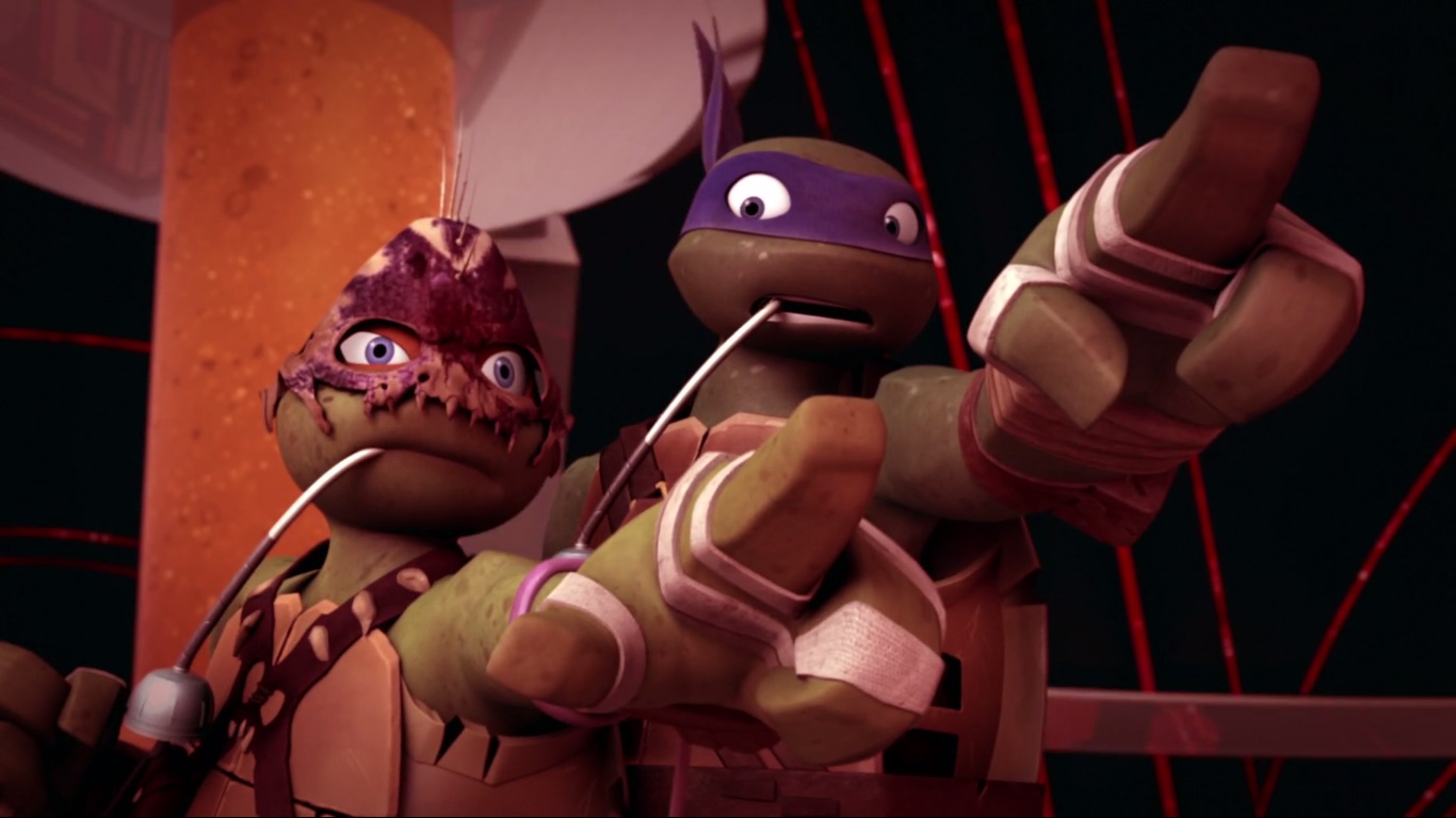 La voie libre, Donatello pouvait se concentrer sur le réservoir du vaisseau. La tortue était stupéfaite de voir la quantité de mutagène qui était stockée dans l’appareil. Il lui servait de carburant. Michelangelo essayait de son côté de piloter le Technodrome. Après quelques pianotages hasardeux, le génie improvisé parvenait à le mettre en marche et partait en direction de l’astéroïde où travaillent les habitants de New York. Donatello ouvrait le compartiment où était stocké le mutagène, qui permettait de faire fonctionner la forteresse géante, afin d’y injecter son rétro-mutagène. Le produit étant différent du carburant habituel, le Technodrome cessait de fonctionner. Une fois encore, l’incroyable génie de Michelangelo entrait en scène. La tortue se lançait dans la reprogrammation du système de fonctionnement de la machine. Mais leur temps était compté. Kraang Subprime se trouvait derrière la porte de la salle des machines. Une mauvaise nouvelle n’arrivait jamais seule, Donatello ne parvenait pas à contacter les Mutanimals au T.C.R.I…