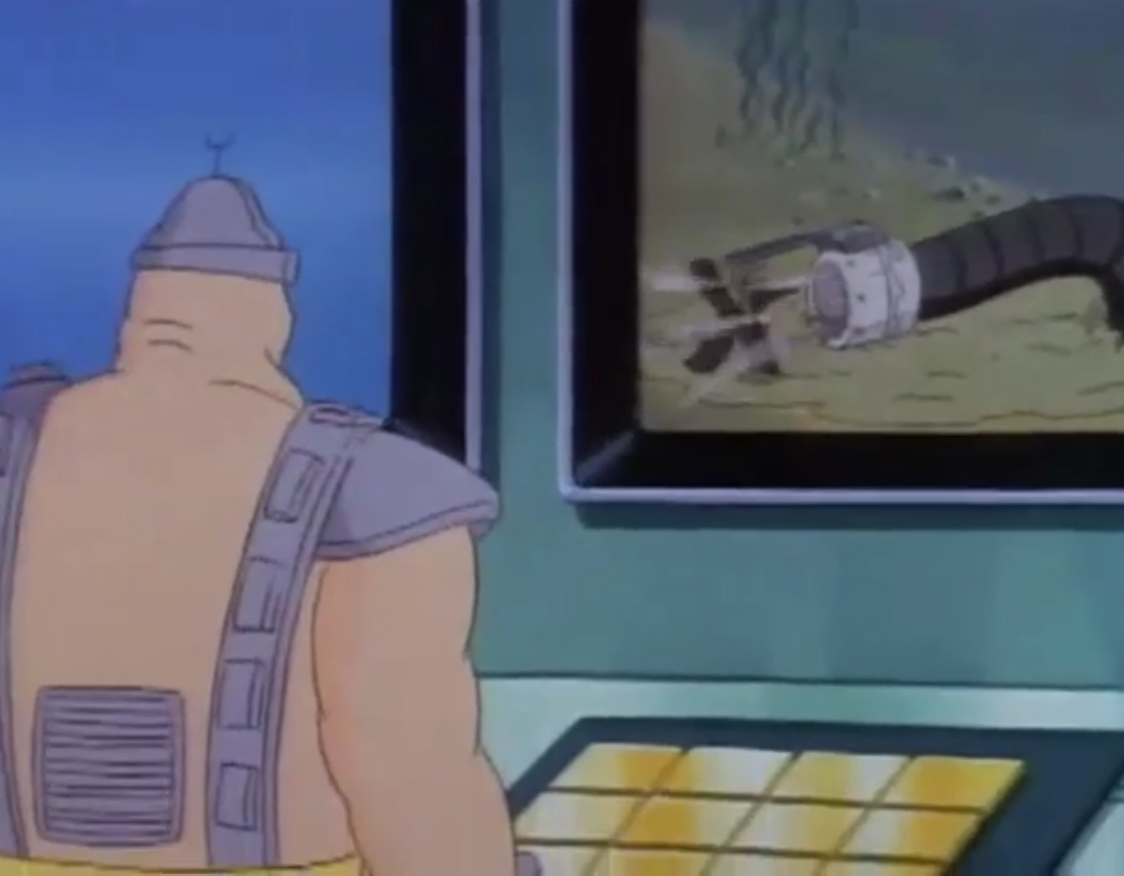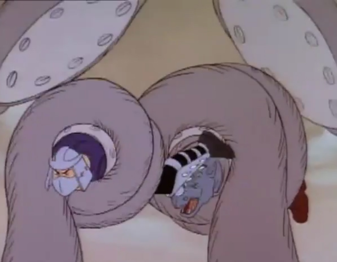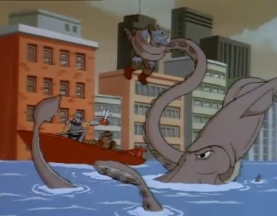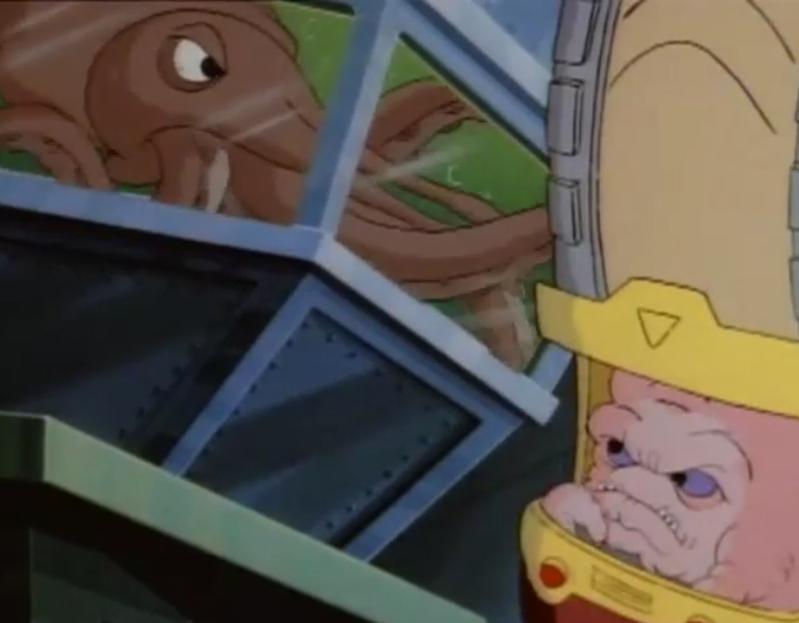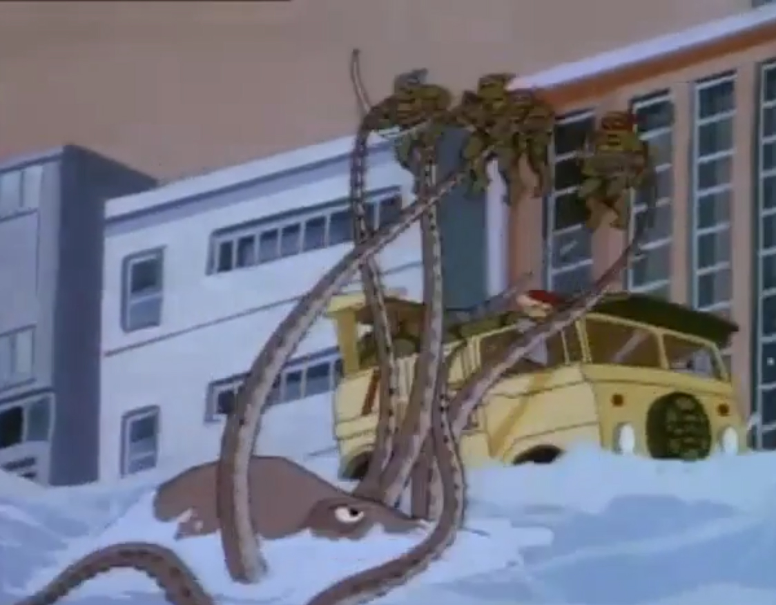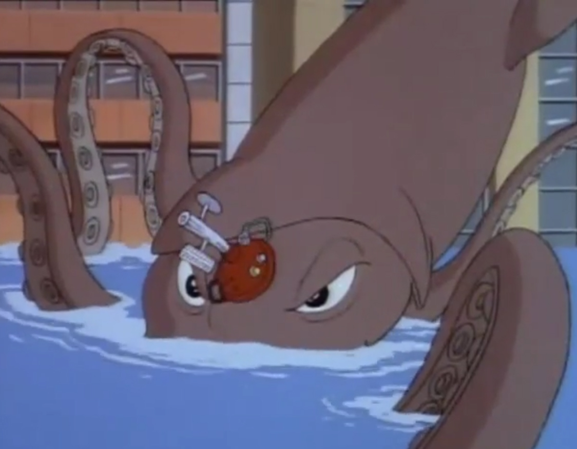 Une pieuvre géante avait été aspirée par les installations de Krang, qui commençaient à présenter quelques faiblesses. Au même moment, Shredder appelait son acolyte pour lui annoncer que les tortues étaient toujours vivantes. L’extraterrestre lui envoyait le mollusque céphalopode. Une fois arrivé au niveau du bateau de Shredder, ce dernier plaçait un neutraliseur de volonté, machine construite à partir d’une ventouse et permettant de contrôler l’animal. Une fois arrivée, la pieuvre recevait l’appareil au milieu de son front. Elle obéissait à Shredder au doigt et à l’œil.