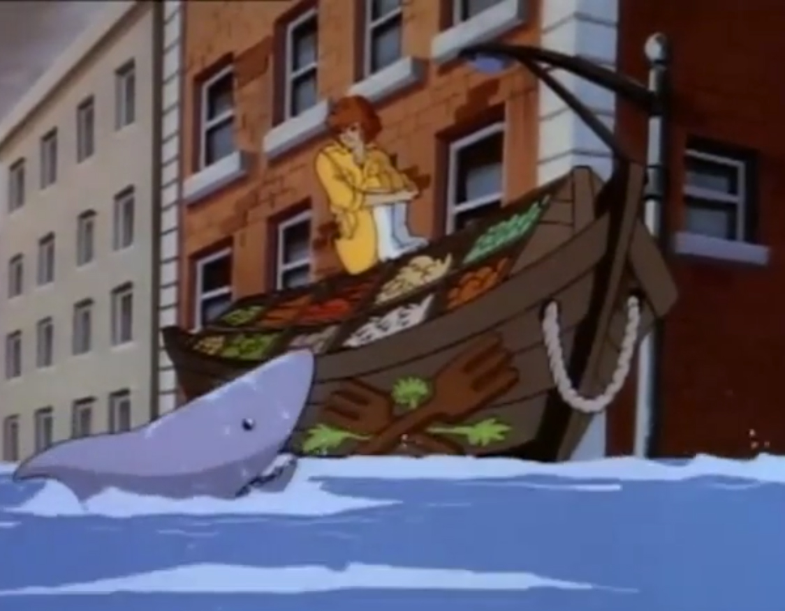 Ils partaient à la recherche de Shredder. Sur leur chemin, ils croisaient April, qui avait fort à faire avec un requin. Raphael, à l’aide d’une ruse, piégeait le poisson géant dans une cabine téléphonique.
