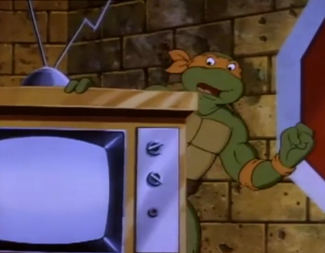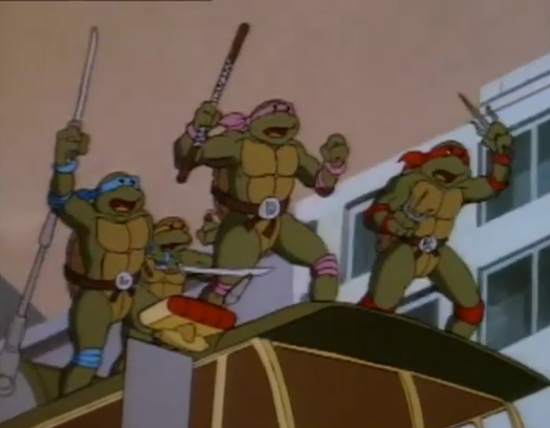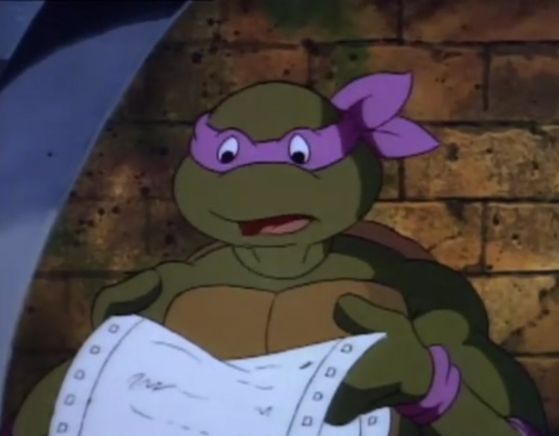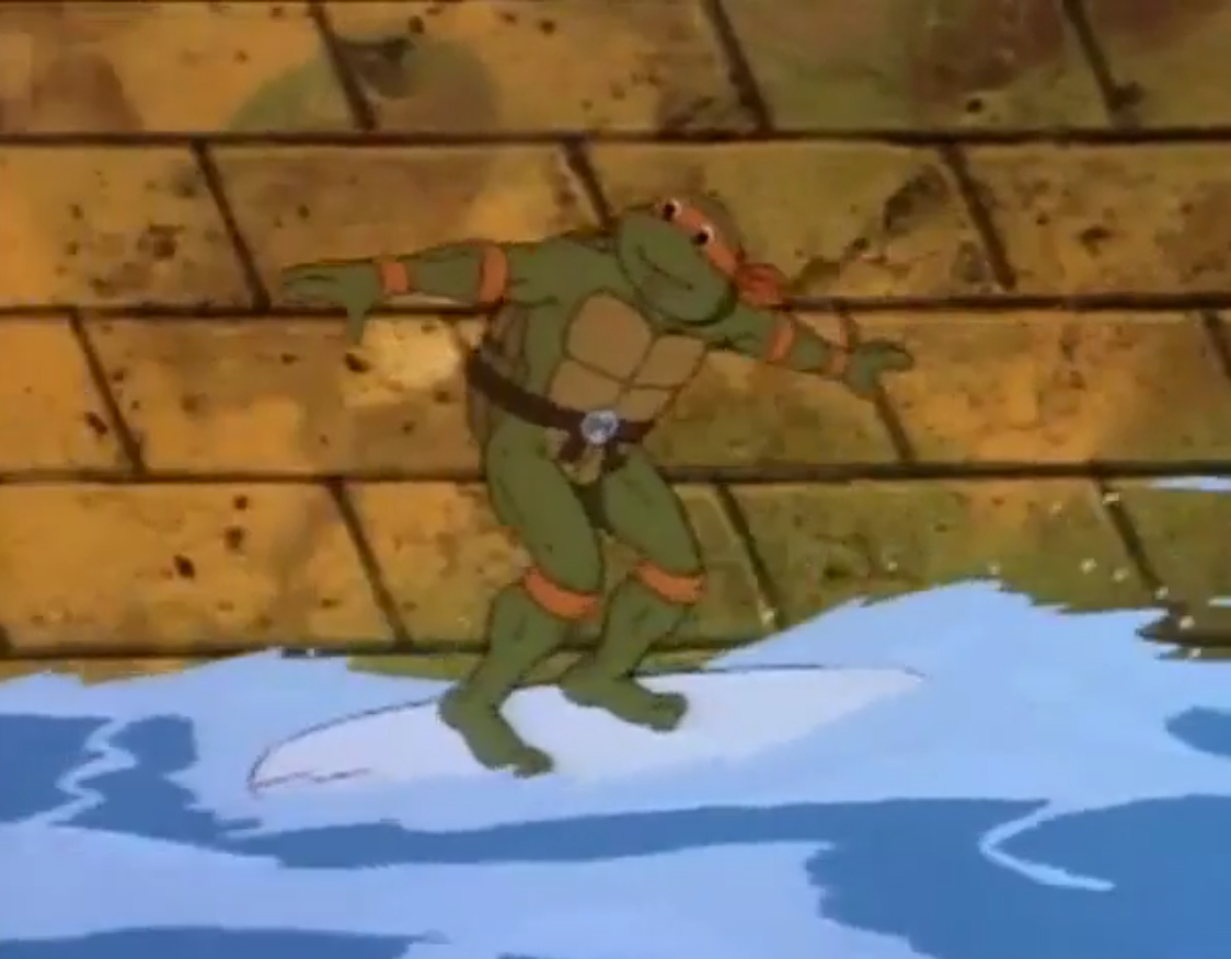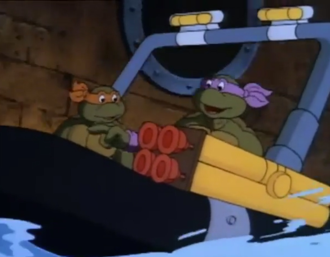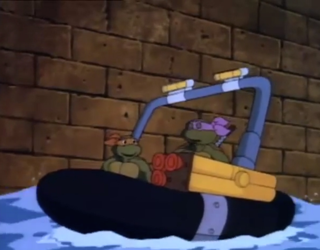 Au fond des égouts, Donatello testait une de ses dernières inventions avec Michaelangelo. Une bouée de déplacement avec tout un arsenal de combat. Il voulait essayer son lance ventouses en conditions réelles pour capturer une grenouille. Mais celle-ci, agile et rapide dans l’eau, s’enfuyait, trainant derrière elle la bouée, rattachée à une corde. La tortue était contrainte de couper le lien s’ils ne voulaient pas terminer trop loin dans le canal. Une fois le batracien libéré, ils repartaient pour le repaire.