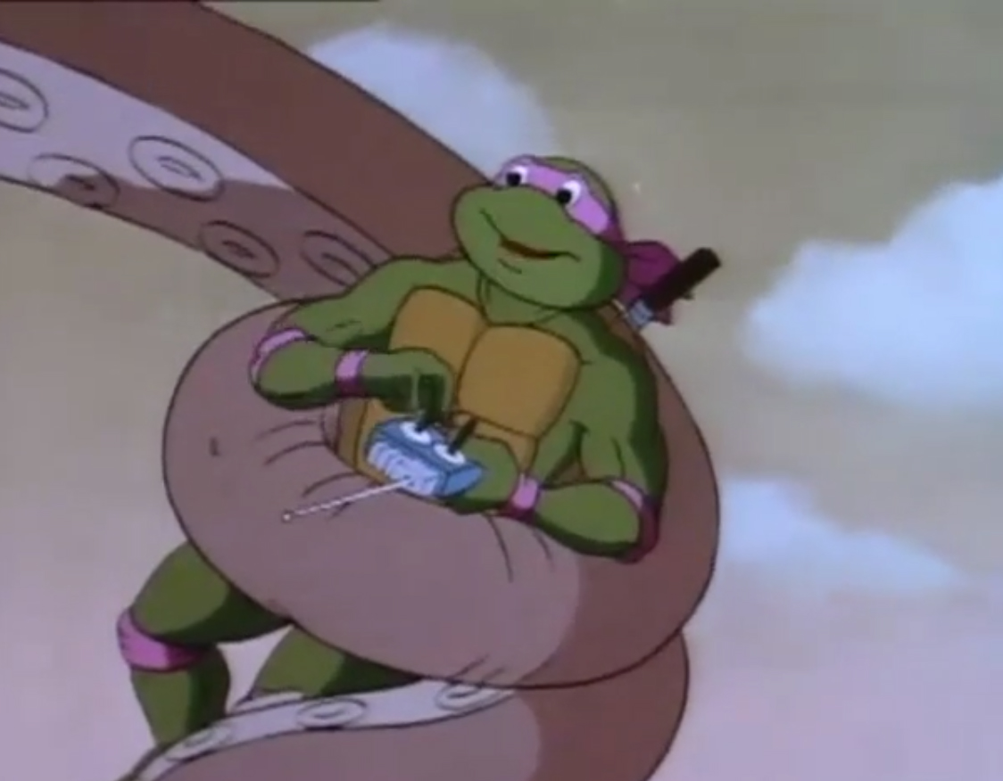 Donatello s’empressait de récupérer. Il pouvait contrôler la pieuvre géante et l’envoyait sur leurs ennemis. Mais Michaelangelo s’en mêla, voulant jouer un petit peu. Hélas, touchant aux boutons sans savoir comment s’en servir, la tortue permettait à leurs ennemis de prendre la fuite. Il n’y avait plus rien à faire. Donatello débarrassait la pieuvre de son appareil, lui rendant sa liberté. Le mollusque regagnait l’océan.