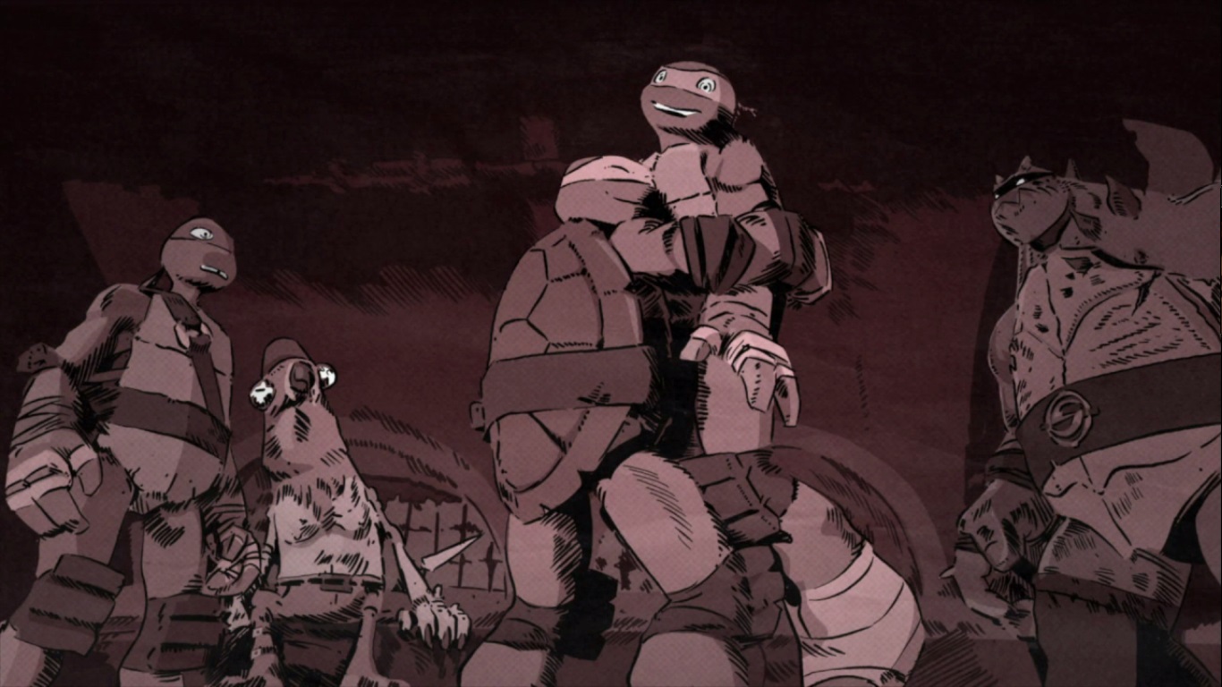 Ses frères n’étaient pas loin. Investissant le repaire, ils neutralisaient les robots qui se trouvaient sur leur chemin, jusqu’à arriver dans la grande salle. Ils voyaient Raphael, pointant son arme vers Shredder, jeté au sol. Ayant perdu son combat, l’homme au masque de fer lui avait ordonnait de s’arrêter. Leonardo ne comprenait pas ce qu’il se passait et encourageait son frère à terminer au contraire le travail et tuer Shredder. La tortue se retournait vers lui. Raphael était bientôt rejoint par Slash et Rockwell, ainsi que Tiger Claw. Le mutant saisissait des tekko-kagi, comme Shredder, pour livrer bataille à sa famille.