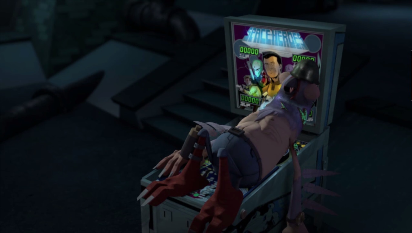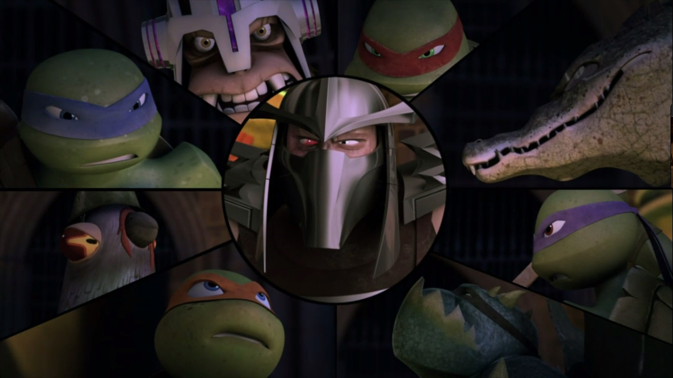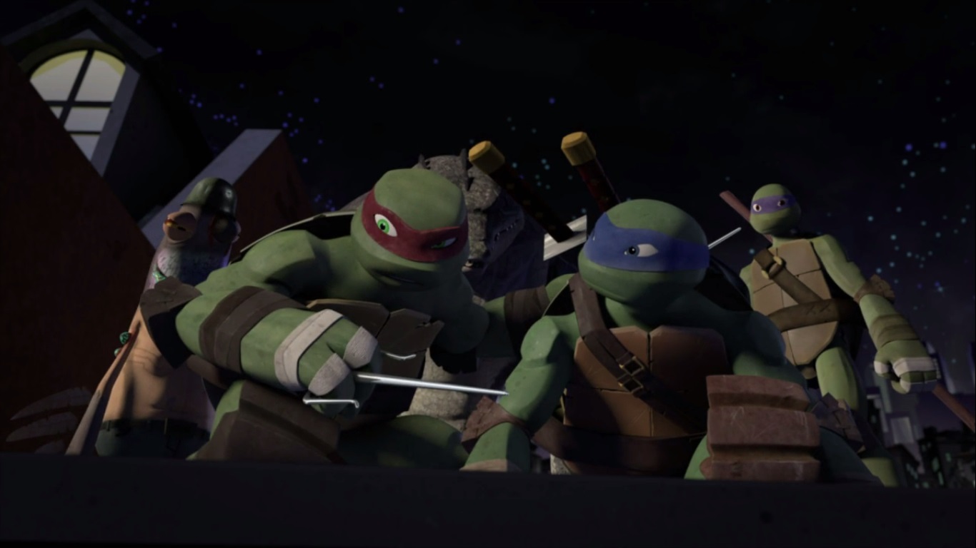 Les tortues, ainsi que Pete et Leatherhead réfléchissaient à un plan d’attaque depuis les toits en face de la demeure de Shredder. Raphael voulait en finir avec Shredder et était prêt à foncer, comme toujours, tête baissée. Mais Leonardo le retenait. Sans plans, c’était inutile de passer à l’attaque, ils ne savaient même pas où se trouvaient leurs ennemis et les deux victimes à sauver. Le pigeon se portait volontaire pour voir ce qui se passait dans la haute bâtisse, volant jusqu’à une baie vitrée.
