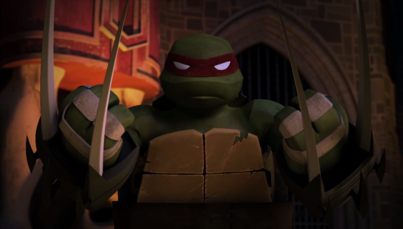 Raphael avait été conduit dans les souterrains du repaire. Il se trouvait dans une galerie au plafond haut, cerclée de cinq statues gigantesques. La tortue apercevait Shredder, qui posait son casque sur la tête. Lui tournant le dos, il lui ordonnait de s’arrêter, lorsque le ninja s’apprêtait à lui planter son saï dans le crâne. Toujours d’un ton calme, il ordonnait à la tortue de s’agenouiller. Raphael, contre son gré, s’exécutait. Ensuite, il lui ordonnait de l’attaquer, sans montrer de pitié. Le ninja se relevait et cherchait à lui asséner des coups. Tout se déroulait comme l’homme le désirait. Il en avait fait son pantin.
