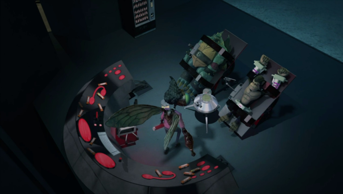 Dans le laboratoire de Baxter Stockman, Shredder se réjouissait du succès de la mission de Tiger Claw, qui lui rapportait l’élément manquant à la préparation que la mouche devait réaliser. Baxter était prêt à se lancer dans l’expérience pour contrôler l’esprit de Karai, mais Shredder désirait avant tout tester ce sérum sur les deux mutants capturés afin de voir quels étaient les risques. La mouche s’approchait de Slash et de Rockwell, attachés à des fauteuils inclinables et déversa le sérum rouge, fraichement récupéré, dans un vivarium contenant des vers de terre. Ceux-ci devenaient des mutants bien plus gros qu’ils ne l’étaient au départ. Les saisissants avec une pince, il les approchait des deux prisonniers…