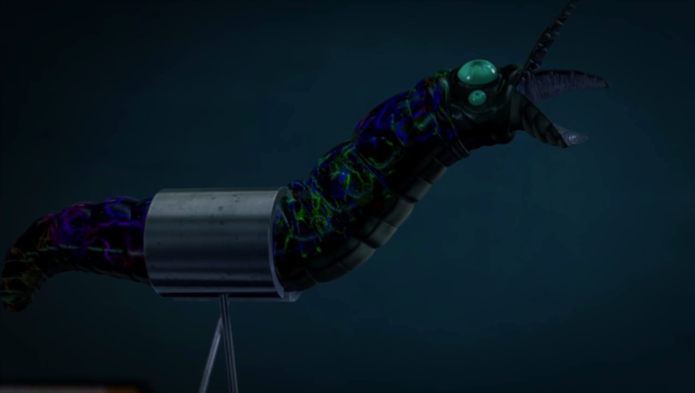 De retour dans le laboratoire de Baxter, la tortue prisonnière était attachée sur une table d’opération. Le scientifique raté déposait un de ses vers sur le front de la tortue, qui criait jusqu’à ce que celui-ci pénètre son crâne pour atteindre son cerveau et le contrôler.