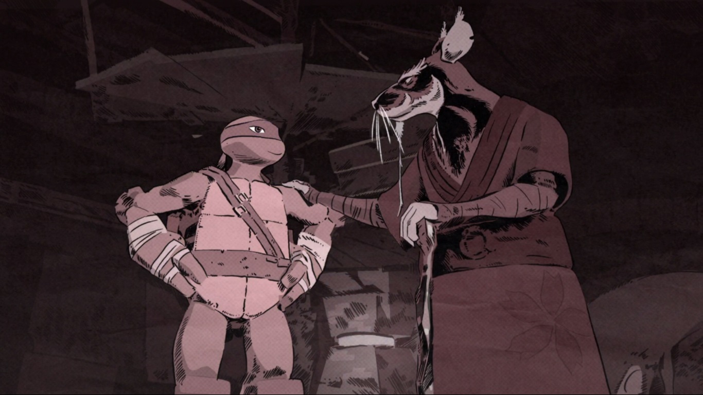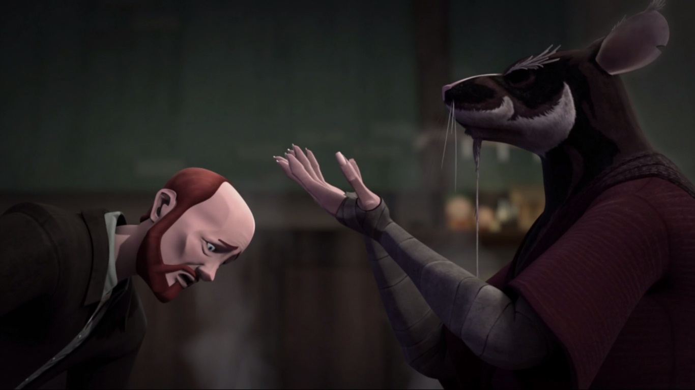 Dans le dojo, Leonardo menait un combat acharné contre Splinter, bokkens en main. Raphael et Donatello observaient le déroulement de la bataille qui était très inhabituelle. En effet, Splinter avait encore beaucoup de mal à se remettre de ses blessures, après le coup porté par Slash (Le choc des Mutanimaux, S3 E16). Peinant à reprendre son souffle, le rat était terriblement fébrile. Son fils hésitait à lui porter le coup final, voyant un adversaire affaibli. Le rat se relevait pour le disputer avant de poursuivre le combat. Mais cela n’était que de courte durée, Leonardo prenait l’avantage de nouveau et cette fois, pointait son bokken vers la tête de son adversaire en guise de victoire. C’était la première fois que la tortue parvenait à prendre le dessus sur son père lors d’un entraînement – bien que l’avantage n’était pas loyal, il le reconnaissait volontiers. Splinter se mit alors à genoux et commença à prononcer une suite de mots. C’était avec ces mantras qu’il se soignait petit à petit. Intrigué, Leonardo lui demandait de lui apprendre.