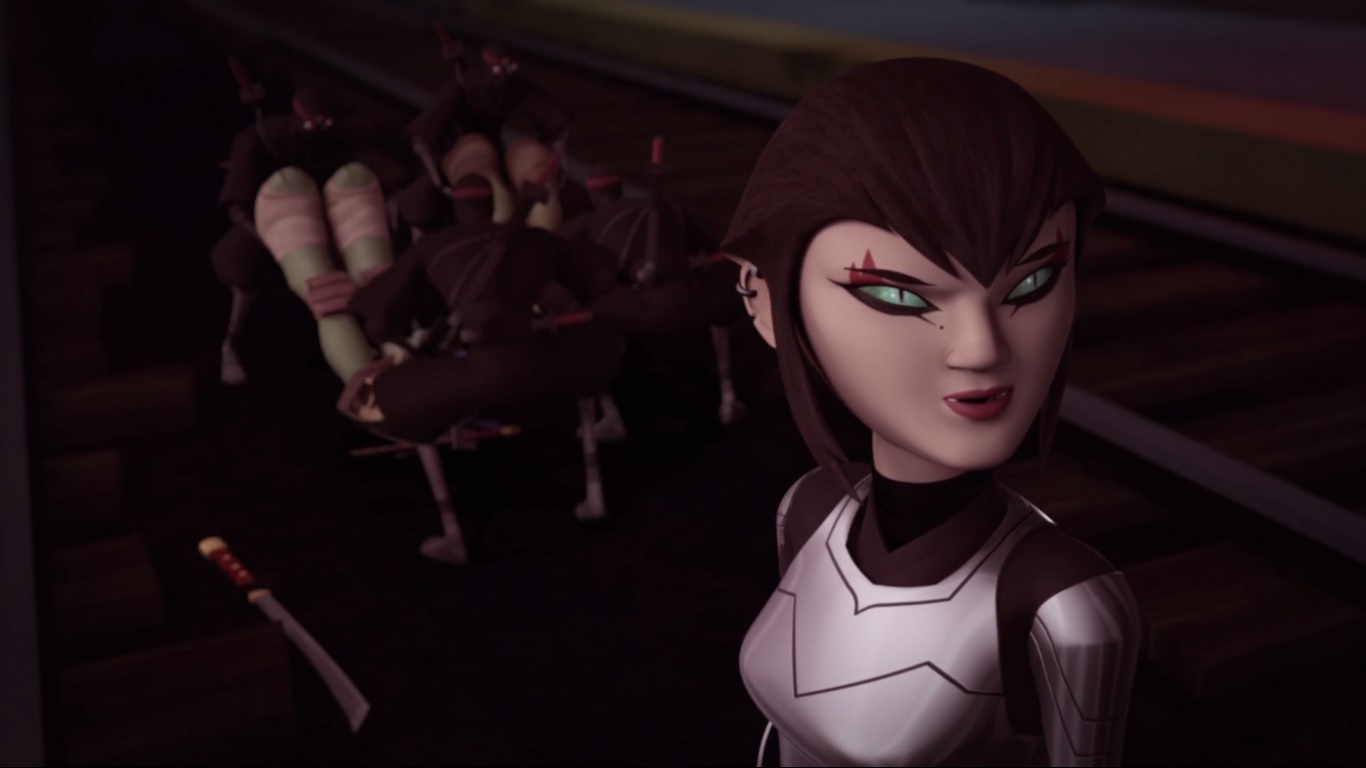 Tout était prêt. Baxter était enfin parvenu à stabiliser les vers pour le contrôle de la pensée. Devant Shredder, il libérait une de ses créatures qui venait se loger dans le cerveau de Karai. La jeune femme qui se montrait jusqu’alors menaçante, était devenue calme. Son père adoptif demandait des preuves de sa servitude et lui ordonnait de s’attaquer à Rocksteady. D’un bond, elle sautait sur le rhinocéros, persuadé de l’emporter face à une frêle femme. La ninja le renversait et manquait de le tuer, plaçant la lame de son kunai devant sa gorge. Retenue par l’ordre de Shredder, elle se retirait de sa victime. Le maître du Foot Clan lui demandait à présent de tuer les tortues, Splinter, et leurs amis humains.