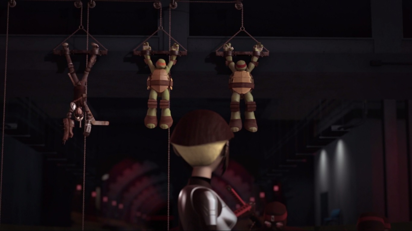 Leonardo arrivait à peine à se tenir éveiller. Juste ce qu’il fallait pour prononcer les mantras destinés à la guérison et saisir un couteau. Alors que les deux tortues se faisaient hisser sur la structure où étaient retenus les trois autres prisonniers, le ninja se défaisait des Foot-bots. Il avait assez d’énergie pour défier Karai. La femme serpent fondait sur lui. Bien trop affaiblie, la tortue était précipitée au sol et mordue aux bras. Il savait que sa rivale n’était pas dans sa forme habituelle et était décidé à l’aider. Se relevant, il poursuivait la récitation des mantras et parvenait à s’auto-régénérer. Karai, surprise que son poison ne fasse pas l’effet escompté, sautait sur la tortue. Cette fois, elle se faisait repousser et vaincre. Encore en forme, Leonardo libérait ses frères et Casey. Mais il ne s’était pas rendu compte que la jeune femme s’en était allée.
