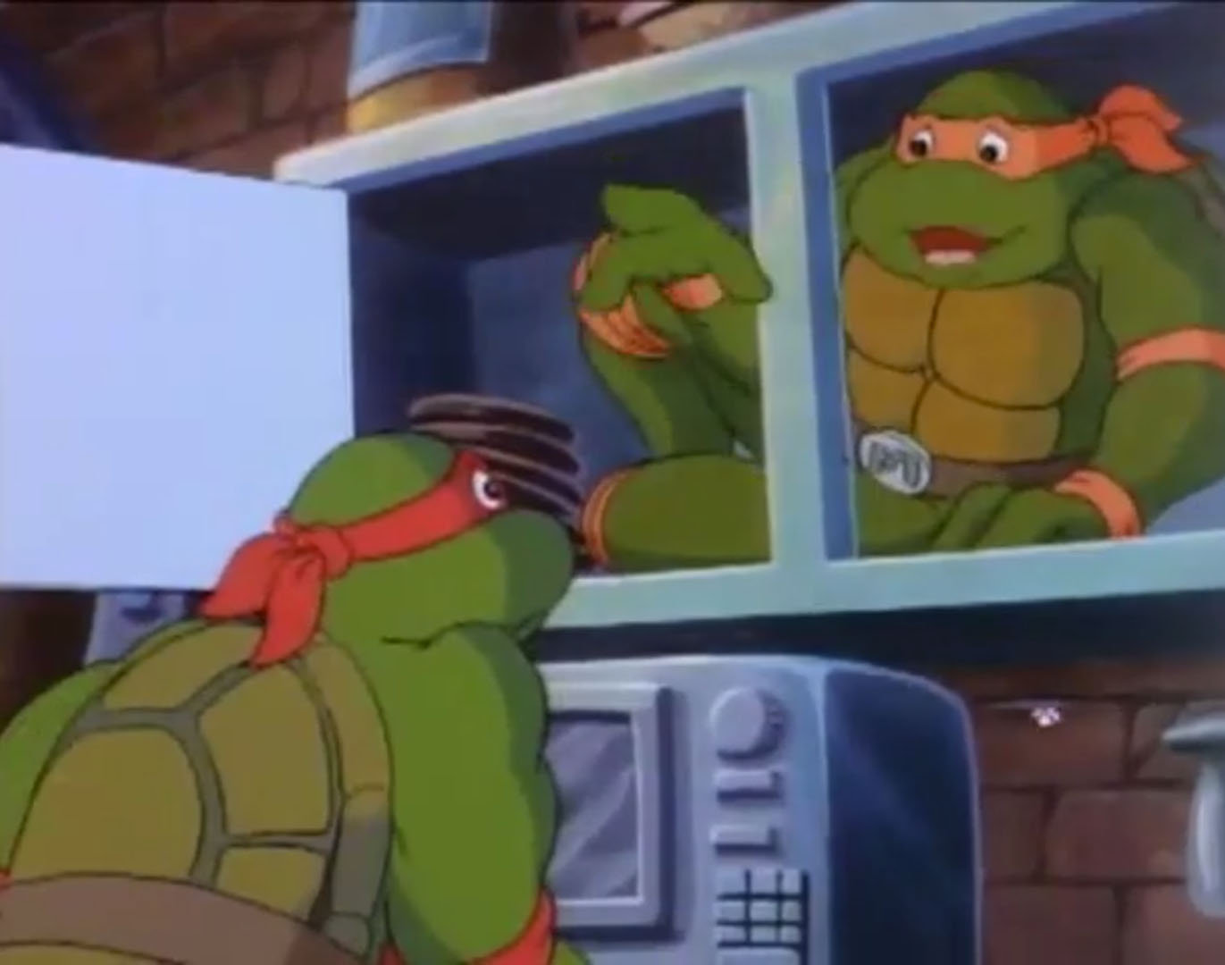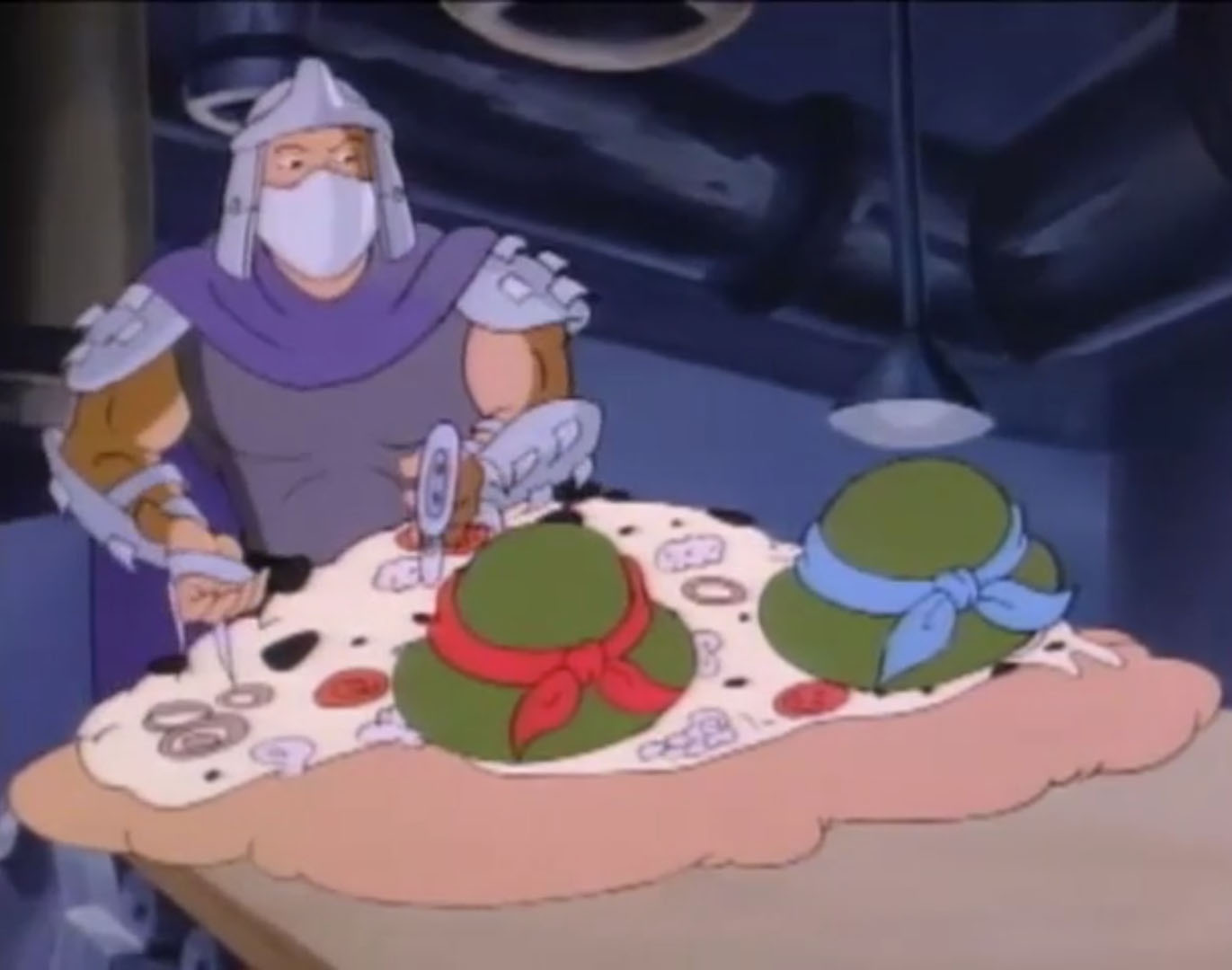 Dans la pizzeria, la tortue mettait beaucoup de temps à se décider. Mais après mûre réflexion, il se rappeler détester les pizzas et demandait simplement un soda. Entraient alors Bebop et Rocksteady, qui le menaçaient avec leurs armes. Le ninja secouait sa boisson et l’envoyait dans les yeux de ses agresseurs. Michaelangelo s’apprêtait à les corriger, mais se rendait compte qu’il n’avait pas ses nunchakus. Peu de temps après, les tortues arrivaient sur place. L’établissement était sens dessus dessous. Alors qu’ils fouillaient les lieux, les frères voyaient Shredder les attaquer. Il avait prononcé par mégarde son propre nom et avait recouvert ses esprits. Il attaquait Leonardo et Raphael, qu’il engluait dans de la pâte à pizza et se préparait à les jeter au four.