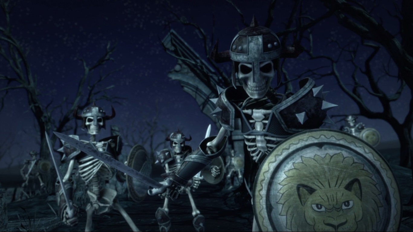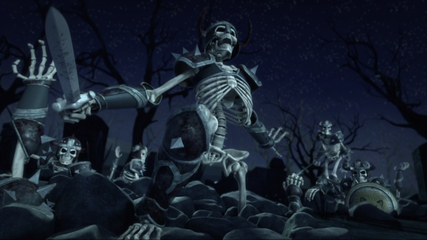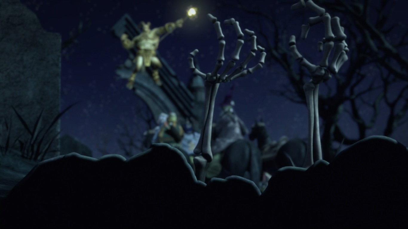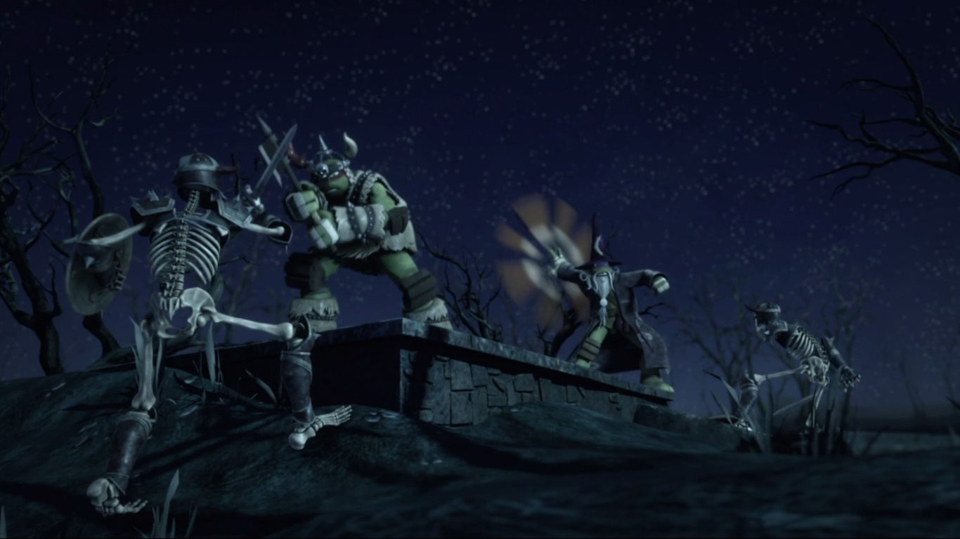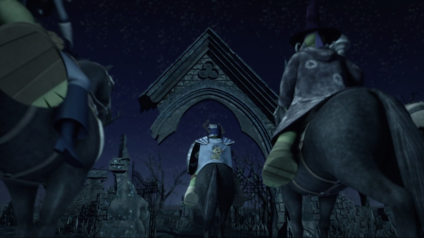 Pour atteindre la forteresse, ils devaient traverser un cimetière sinistre. Soudain, Romero leur apparut dans le ciel, et brandissant son bâton, réveillait une armée de morts. Des squelettes sortaient du sol, armes à la main. Les tortues se battaient vaillamment, tout comme Renet, mais les squelettes parvenaient toujours à se régénérer. Leonardo proposait de poursuivre leur route à cheval. Les morts suivaient les compagnons, mais une fois sortis du cimetière, perdaient leur enchantement et tombaient en miettes.