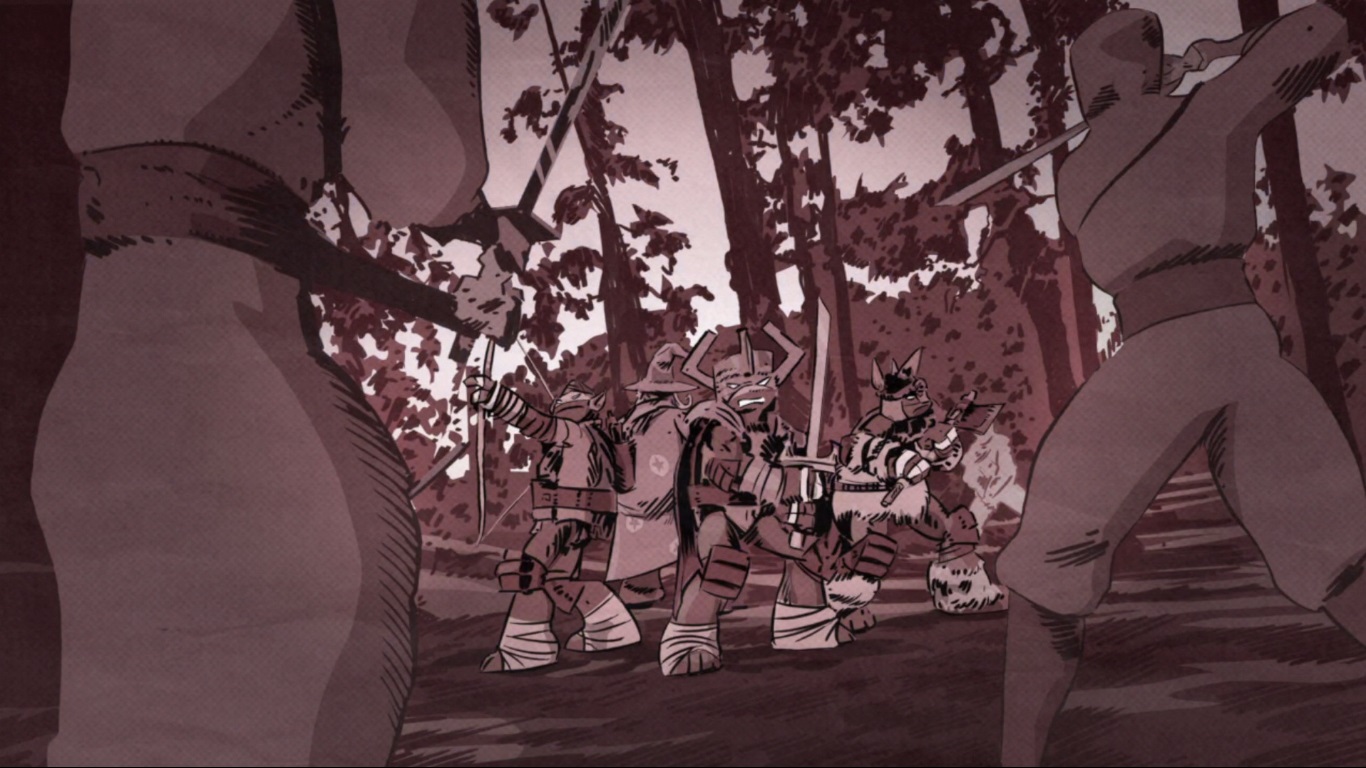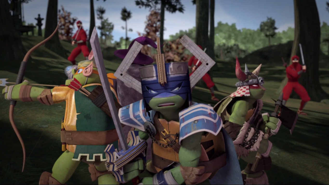 Une fois le combat achevé, le seigneur Simultis apparaissait à l’apprentie Maîtresse du Temps. Il lui ordonnait de rentrer avec le sceptre. Bien qu’effrayée, elle se pliait à son désir, et accompagnée des tortues, ouvrit une porte pour le voyage. Mais dans le couloir du temps, les tortues se faisaient happer par une force. Elles étaient séparées de Renet, et atterrissaient de nouveau dans une forêt. Mais celle-ci donnait une vue en contrebas sur une ville qui semblait moderne. Le Japon ? Pas le temps d’en savoir plus, les tortues étaient encerclées par des ninjas vêtus de rouge…