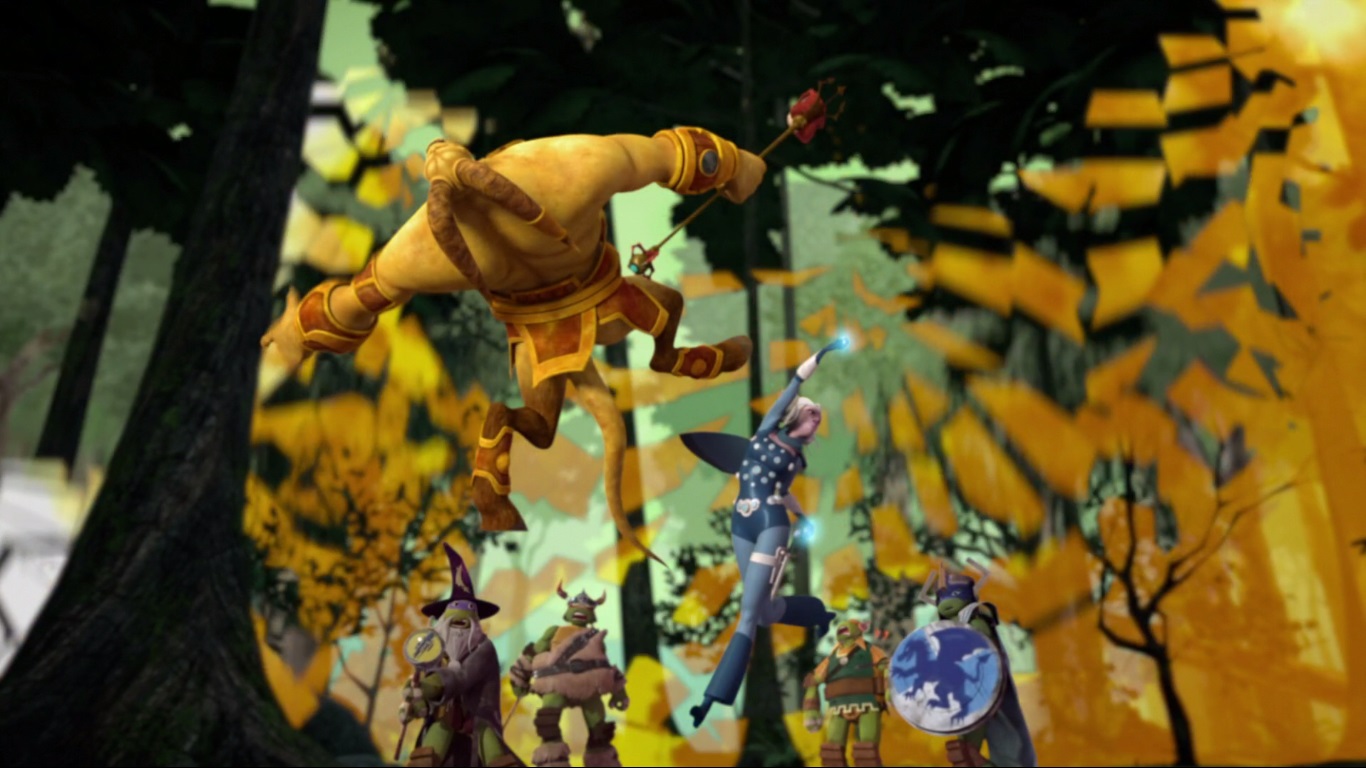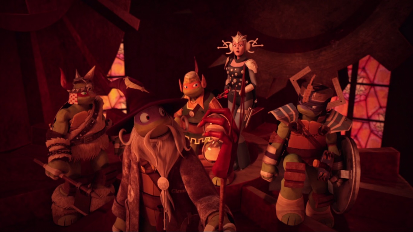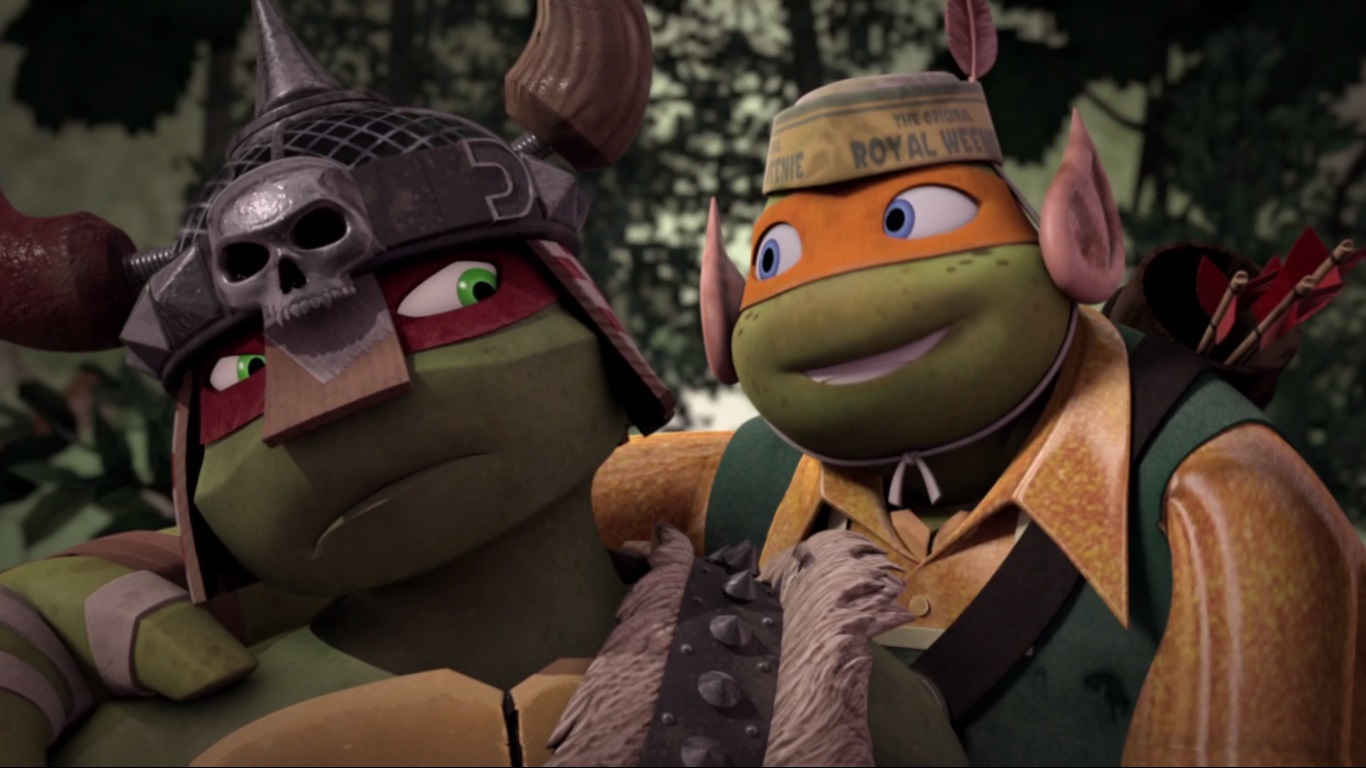 Un passage s’ouvrait dans une forêt. Les tortues et Renet sont déboussolées et n’ont aucune idée d’où ils se trouvent, jusqu’à ce que Donatello lise un panneau de bois indiquant la direction d’Avalon, de Camelot et de la Tour du Démon. Les tortues se trouvaient en Angleterre, en 980 ap. J.C. Pour se fondre mieux dans le décor, Michelangelo demandait à leur nouvelle amie de leur donner des vêtements de circonstance. Elle faisait apparaître leurs costumes de jeux de rôles.