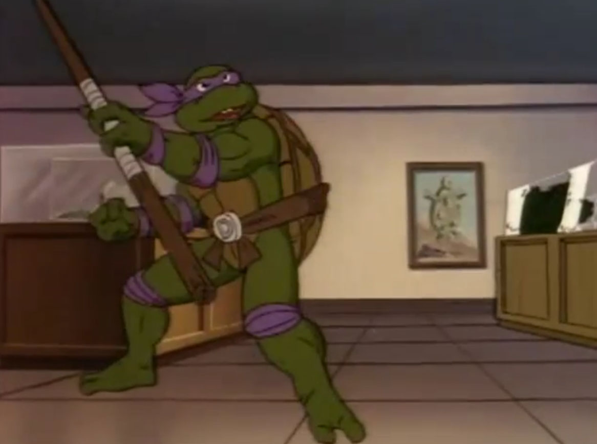 - Raphael pousse une statue de tortue géante sur Rocksteady dans le musée. Il s’agit pourtant d’une pièce anthropique qui devrait plutôt se trouver dans un musée d’archéologie et non un musée d’histoire naturelle ! Encore pire pour les armes et les armures vues dans la salle d’à côté…