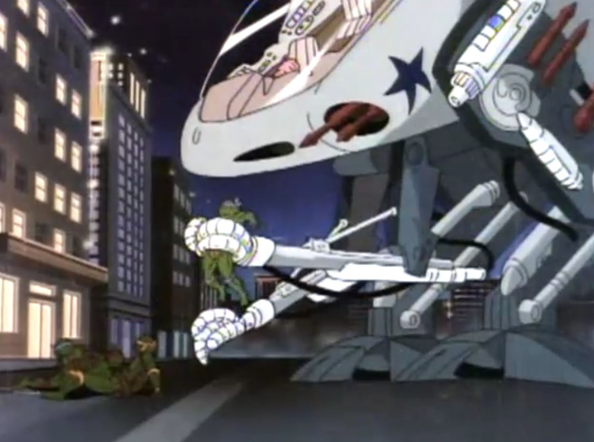 La coupure publicitaire annonçait le passage des Tortues Ninja dans l’émission de Kellerman. Cela donnait une merveilleuse idée à Krang. Il s’empressait de choisir une arme parmi l’arsenal de l’armée, tel un déstabilisateur atomique, un rayon glacial… Mais il s’agissait d’armes trop puissantes et destructrices. Il voulait quelque chose dont les gens puissent se souvenir. Après quelques heures d’étude, il avait enfin trouvé son arme. Une machine bipède géante. Il proposait à Shredder de l’accompagner pour faire diversion tandis qu’il s’installerait dans le cockpit de cette terrible machine.