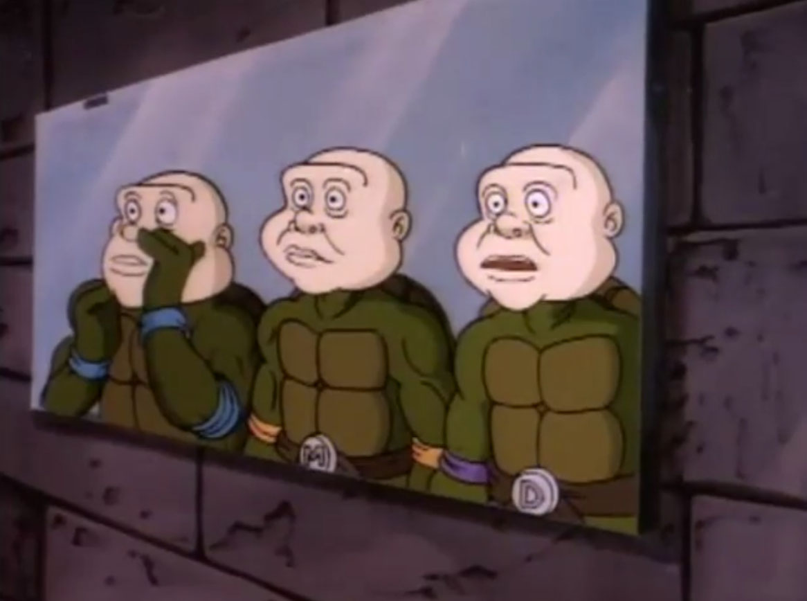 Au cours du combat dans le musée, Michaelangelo dit avoir une idée. Dans la version française, le plan suivant montre Bebop en train de lui envoyer des boulets de métal pour détruire son armure. Mais quelle armure ? En réalité, l’idée de la tortue était de revêtir une armure médiévale pour courir derrière Shredder qui le menaçait avec une arbalète, nunchakus à la main. Il reçoit alors un premier boulet qui lui fait perdre une partie de son amure, raison pour laquelle il en possède encore quelques morceaux dans la version française. Une coupure très sale !- Lorsque les tortues se font maquiller pour passer dans l’émission de Kellerman, Michaelangelo est encore terriblement nerveux. Dans la version non censurée, il sort de derrière sa carapace un nunchaku pour le bidouiller du bout de ses doigts. Dans la version française, nous passons du moment où il met sa main dans son dos au plan suivant où il se fait éclairer le visage.