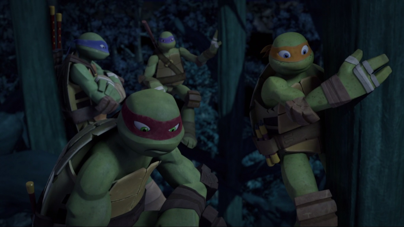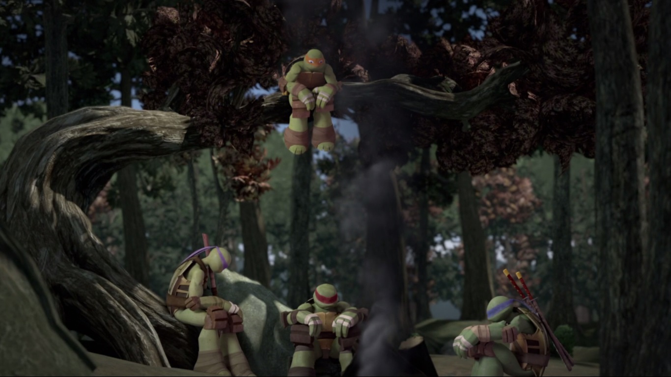 Shen ne l’entendait pas de cette manière, ne voyant plus l’utilité de poursuivre la direction d’un clan ninja mourant à l’aube du XXIe siècle. La jeune femme épuisée partait marcher dans les bois. Elle y rencontrait Michelangelo et Raphael en train de se chamailler. Elle apercevait également non loin Leonardo et Donatello. Les tortues essayaient de la rassurer, mais paniquée à la vue de ces étranges créatures, elle se mit à crier. Yoshi et Saki, tous deux à des endroits différents, accouraient pour la sauver. Le premier sur les lieux était Saki, qui trouva les tortues. Courageux et intéressé, il se précipitait sur les monstres pour les tuer. Les reptiles disparaissaient aussitôt. Donatello ne voulait surtout pas que ses frères et lui interagissent avec le passé.