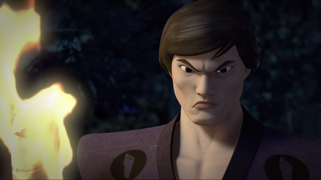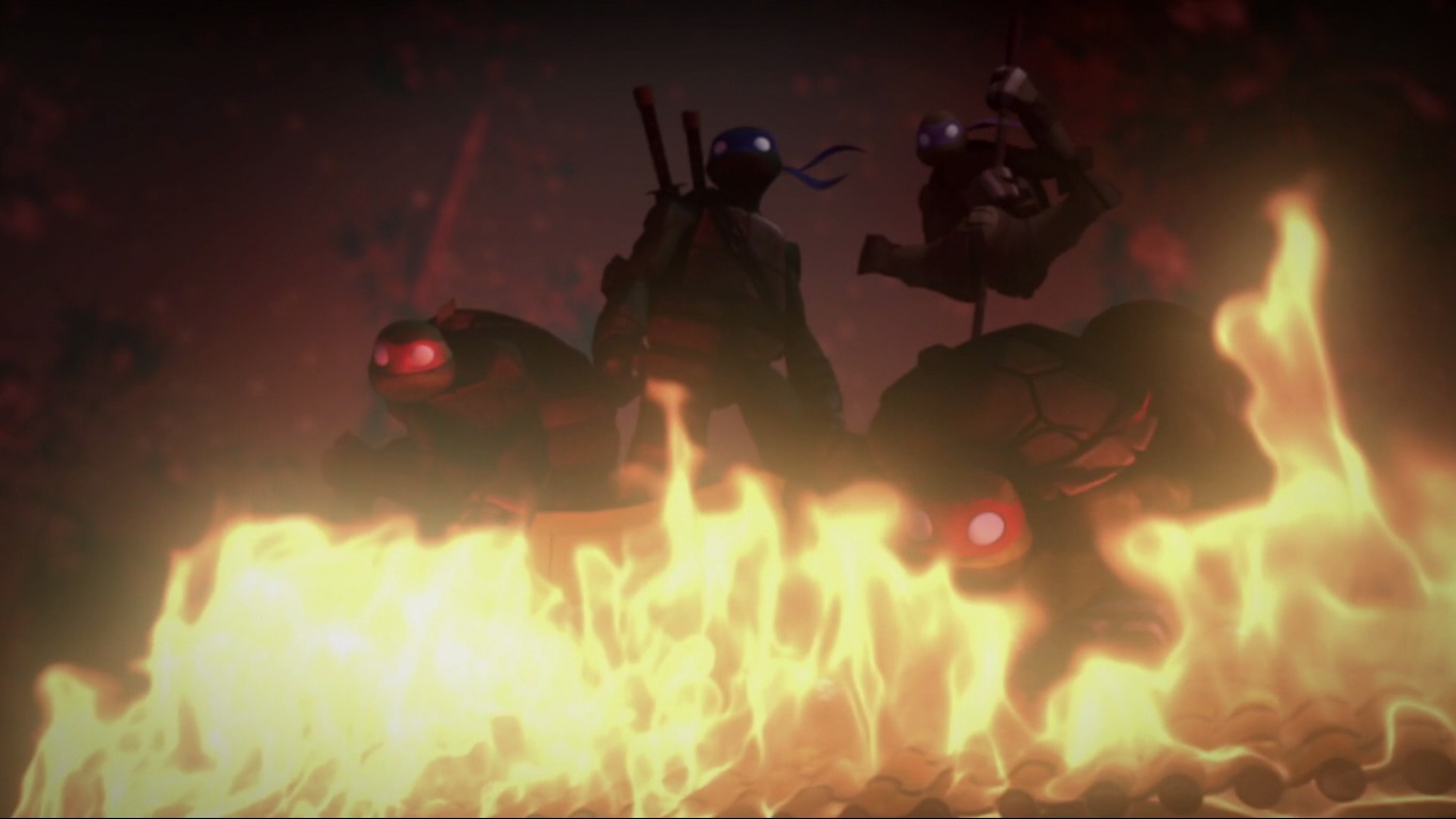 Au même moment, les tortues surgissaient derrière le feu créé par la combustion de l’autel de bois devant lequel Saki refondait son clan. Se faisant passer pour des démons, les yokais s’attaquaient aux traitres du clan Hamato. C’était la panique dans les rangs, les tortues s’en amusaient. Saki ne perdait pas de temps avec ces sottises et s’en allait régler une affaire. Il se dirigeait vers le dojo du clan Hamato