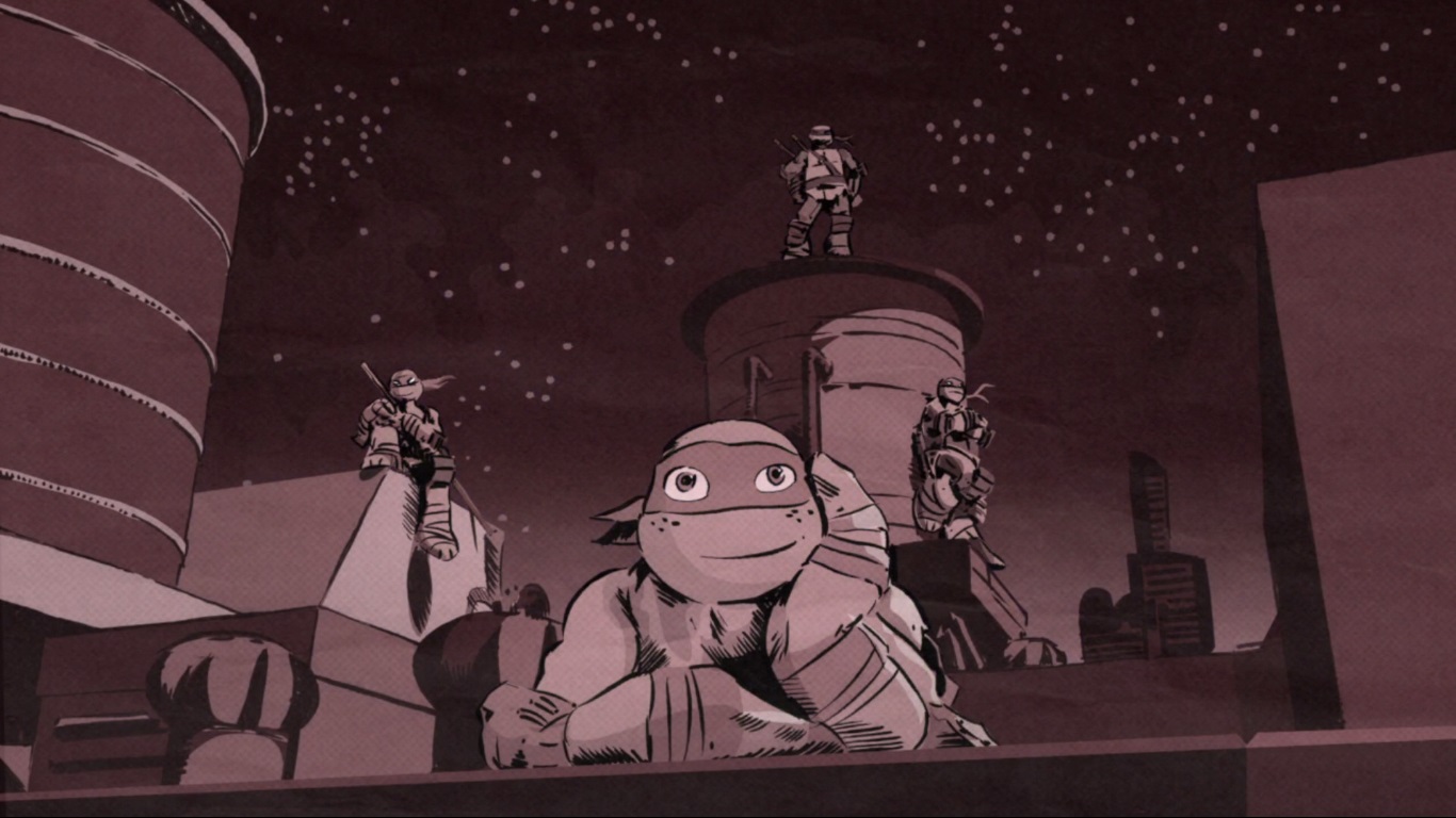 Reprenant leur souffle, loin du champ de bataille, il apparaissait clair que les quatre frères étaient encore coincés dans le passé. Au moins 16 ans avant leur époque. Saki n’avait pas encore trahit Yoshi à ce moment, mais faisait bien partie du même clan. S’avançant dans la forêt, les tortues découvraient une maison dans une clairière. Michelangelo reconnaissait le dojo de leur maître !