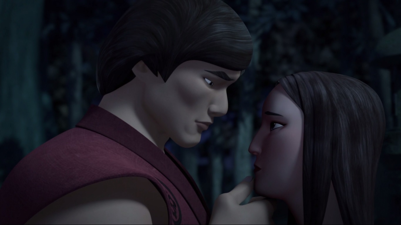 Après ce bref combat, Saki revenait aux côtés de Tang Shen pour la rassurer. Il ne lui cachait pas avoir écouté sa conversation avec Yoshi. Opportuniste, il sentait que c’était le moment de gagner son cœur et de lui dire ce qu’elle voulait entendre. Il cherchait à la convaincre que Yoshi ne partirait pas de son Clan. La femme baissait les yeux, comme convaincue, au fond d’elle-même, que l’homme avait raison. Avant de s’en aller, il embrassait le front de la femme. La scène était observée par Yoshi qui venait d’arriver. Il restait caché derrière un arbre, furieux de ce qu’il voyait. Les tortues se trouvaient cachées dans les arbres et assistaient à toute la scène.