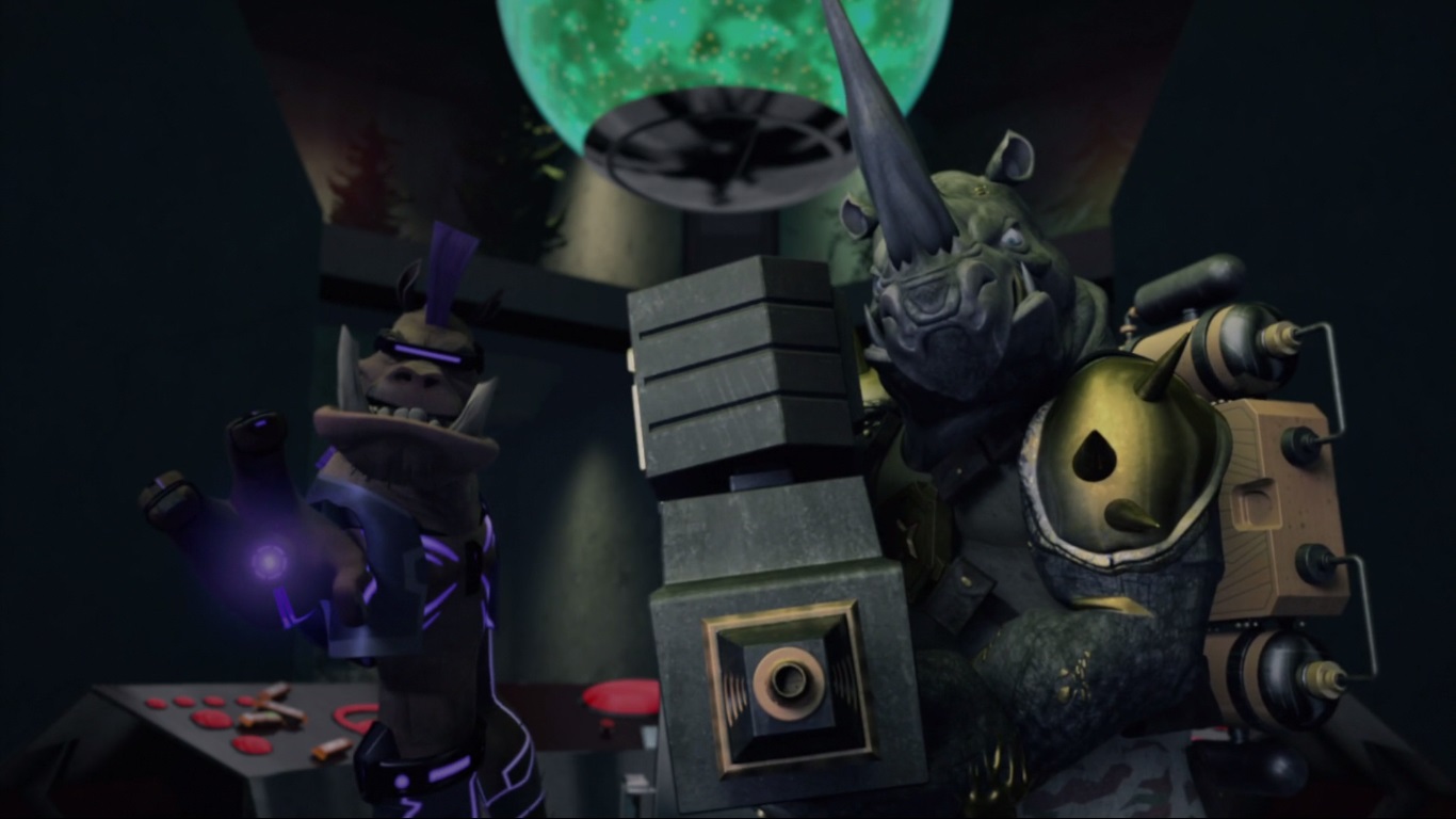 Finalement, les deux tortues arrivaient au laboratoire de Baxter. Les frères n’avaient aucun mal à trouver les vers qu’ils étaient venus chercher. Une fois encore, Bebop et Rocksteady leur barraient la route et s’apprêtaient à leur tirer dessus. Pas moyens pour Leonardo et Michelangelo de s’enfuir, ils se rendaient. Les intrus étaient placés dans une cage, au-dessus d’une cuve de mutagène. Bebop et Rocksteady étaient curieux de voir le résultat que donnerait des versions sur-mutées de leurs ennemis. Leonardo, pour gagner du temps, leur demandait s’ils ne voulaient pas rajouter encore plus de mutants, pour faire un méga-mutant. L’idée séduisait terriblement le rhinocéros, qui agitait une boîte de sardines sous le nez des clones de Shredder. Les trois créatures stupides se jetaient dans la cuve et commençaient à se transformer.