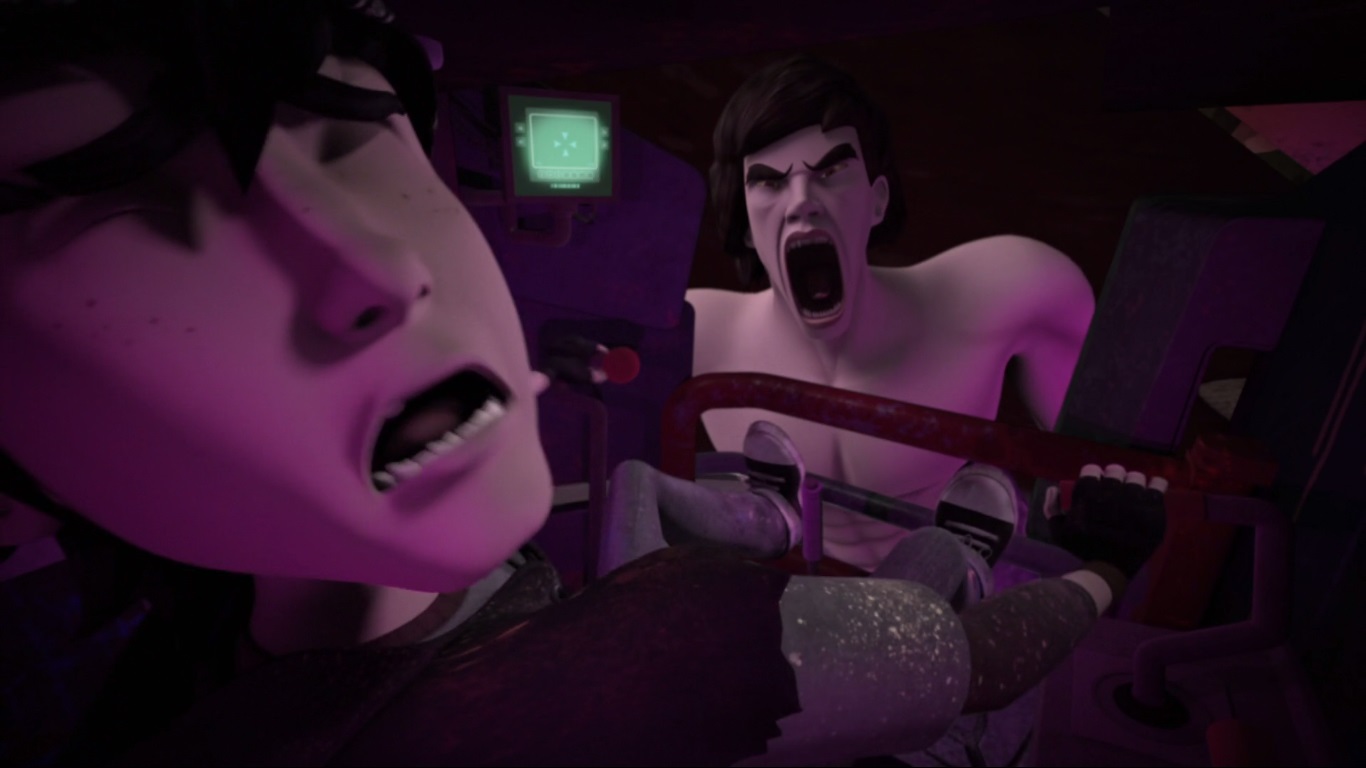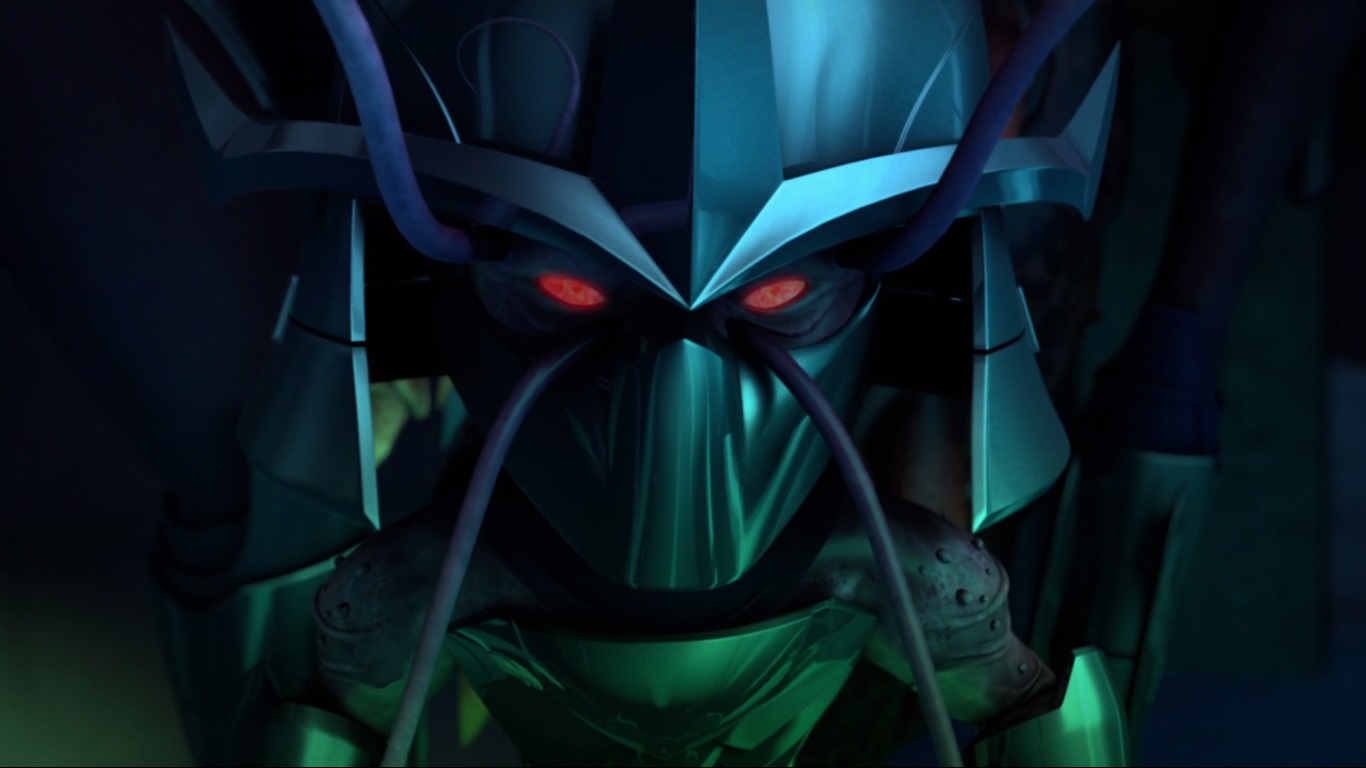 visite à Karai, retenue dans l’une des cellules du laboratoire de Baxter au sous-sol du quartier général. La jeune femme se trouvait attachée à une table, un casque sur la tête. Celui-ci était relié à un bocal, où se trouvait un important nombre de vers qui lui lavaient le cerveau. Shredder se montrait navré de cette situation et lui promettait de très vite en finir avec leurs ennemis. Il ordonnait à Bebop et Rocksteady de renforcer la sécurité des lieux, sentant que les tortues étaient sur le point de porter une nouvelle attaque pour reprendre leur amie. Un nouvel échec ne serait pas toléré…