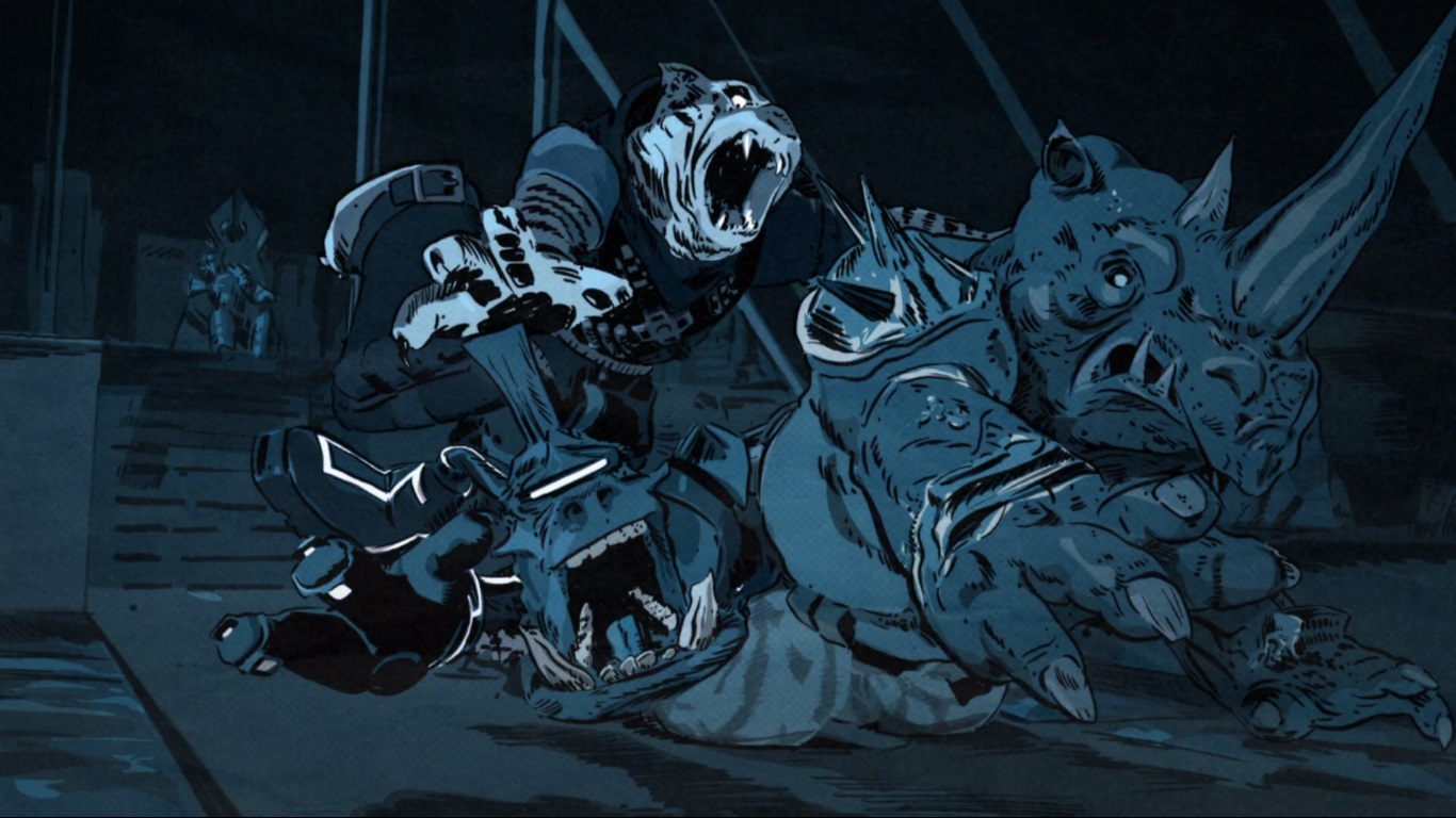Une fois à l’intérieur du quartier général, les quatre frères pénétraient dans les souterrains et l’antichambre du laboratoire de Stockman. Hélas pour les visiteurs, leur route se retrouvait barrée par Rocksteady et Bebop, auxquels s’ajoutait très Tiger Claw, attiré par la cohue. Un combat s’engageait, notamment animé par l’arme lourde du rhinocéros, qui tirait à tout va à travers la pièce ornée de grandes statues. Les tortues ne savaient plus d’où donner de la tête. Si les deux mutants pouvaient encore être neutralisés, l’entrée de Tiger Claw rendait les choses plus corsées. C’est alors que les trois clônes mutants de Shredder arrivèrent à leur tour. Face au nombre d’adversaire devenu totalement déraisonnable, les tortues préféraient battre en retraite. Raphael acceptait difficilement ce plan, mais alors qu’il s’apprêtait à s’en aller, la tortue se retrouvait chargée par Rocksteady. Leonardo l’aidait à se relever, sa jambe droite était blessée.