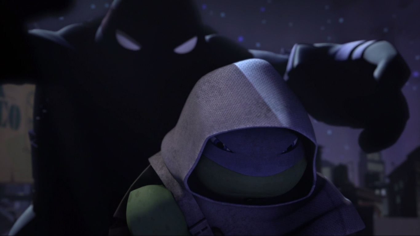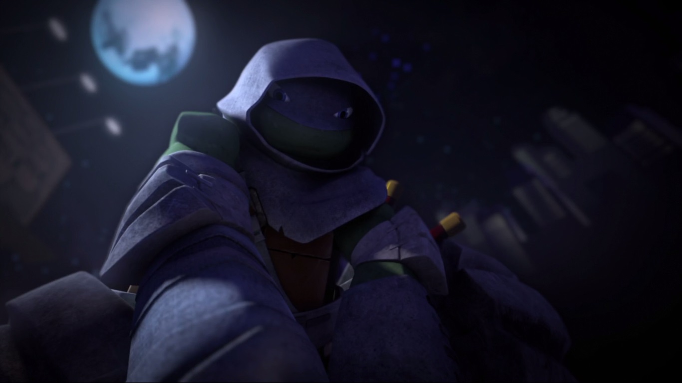 Si son désir de partir seul était connu de ses frères, le moment où il s’en irait l’était moins. La tortue partait de nuit. Michelangelo, qui se faisait un dernier festin de pizza avant de se coucher, l’apercevait et décidait de le suivre. Une fois face au quartier général du Foot Clan, Leonardo découvrait son frère et qu’il ne pourrait accomplir cette mission seul.