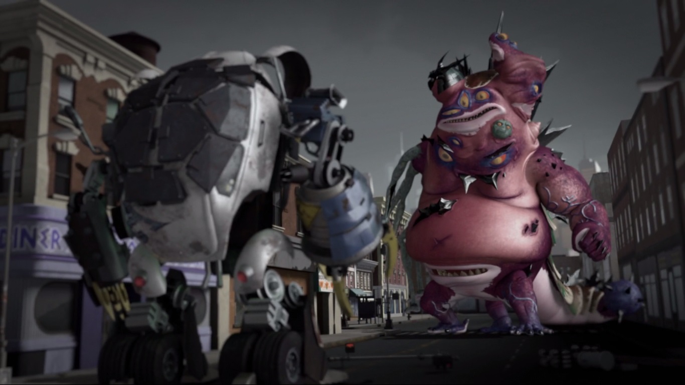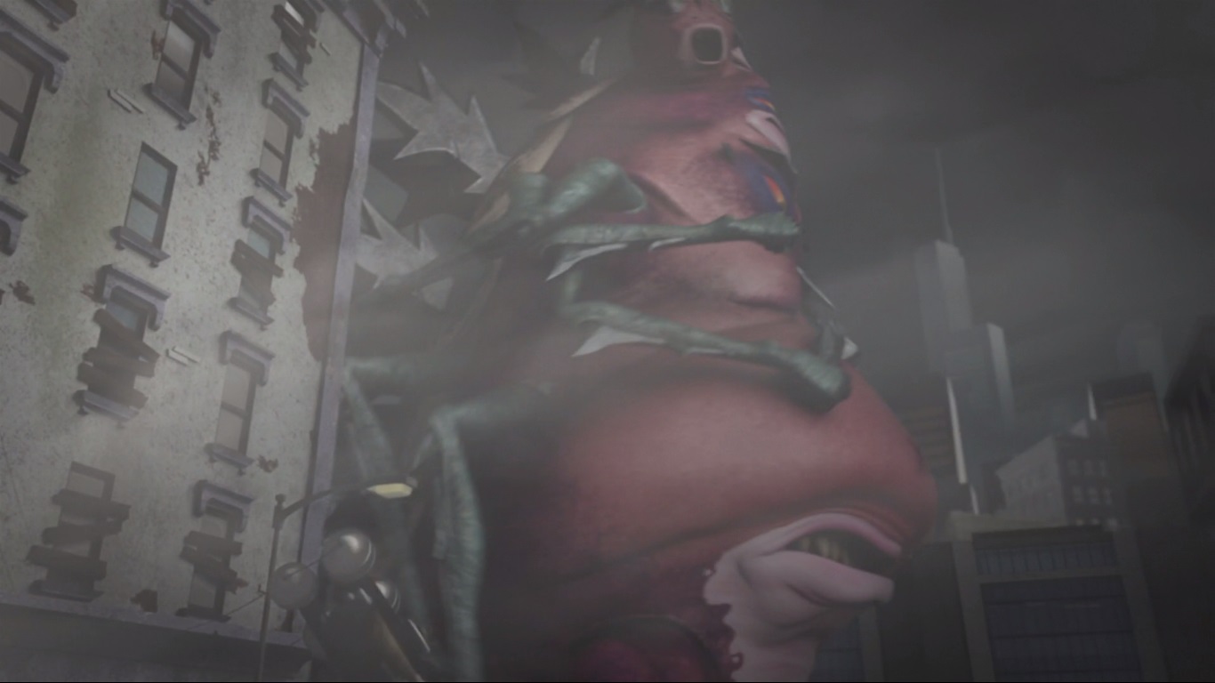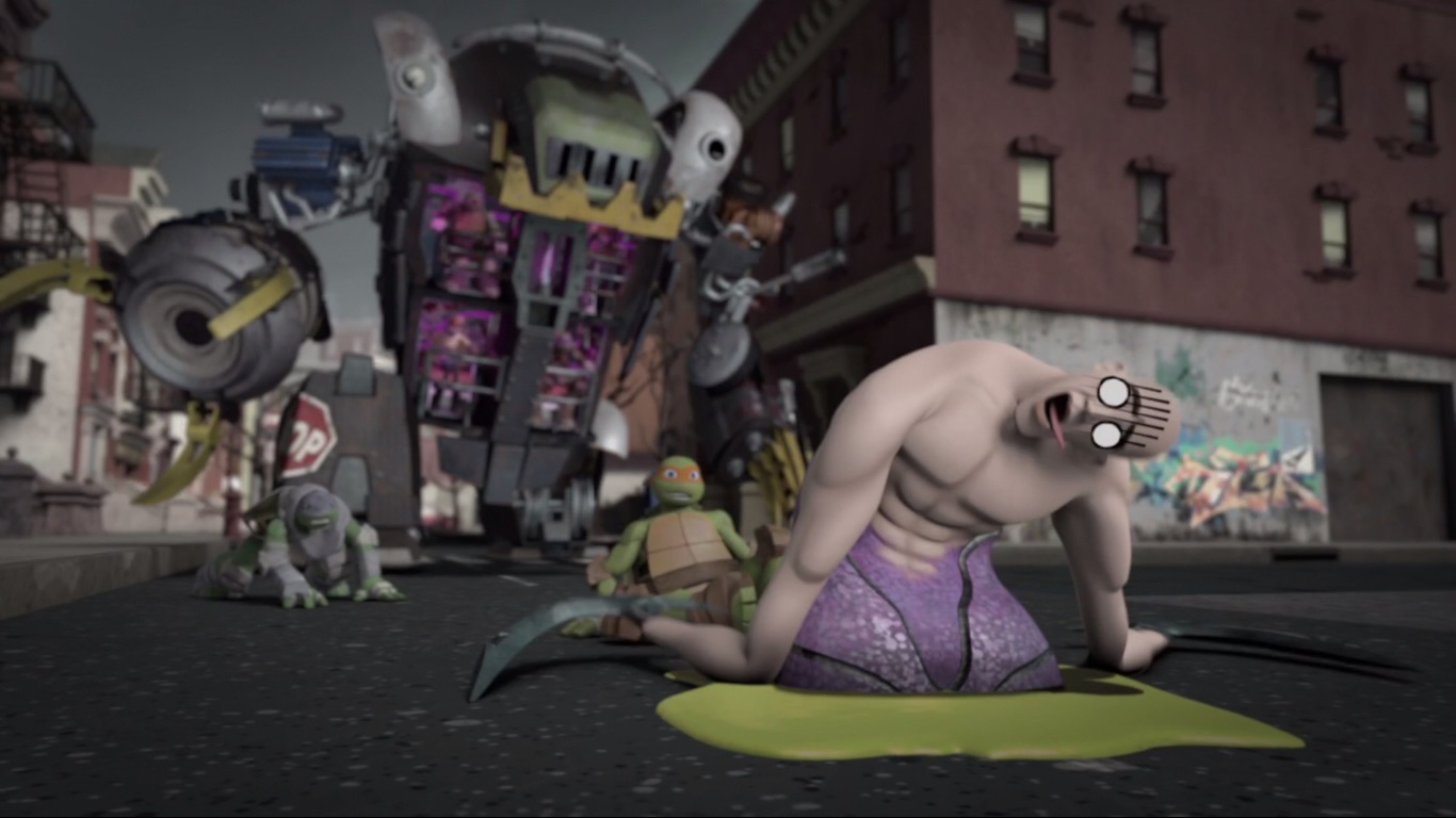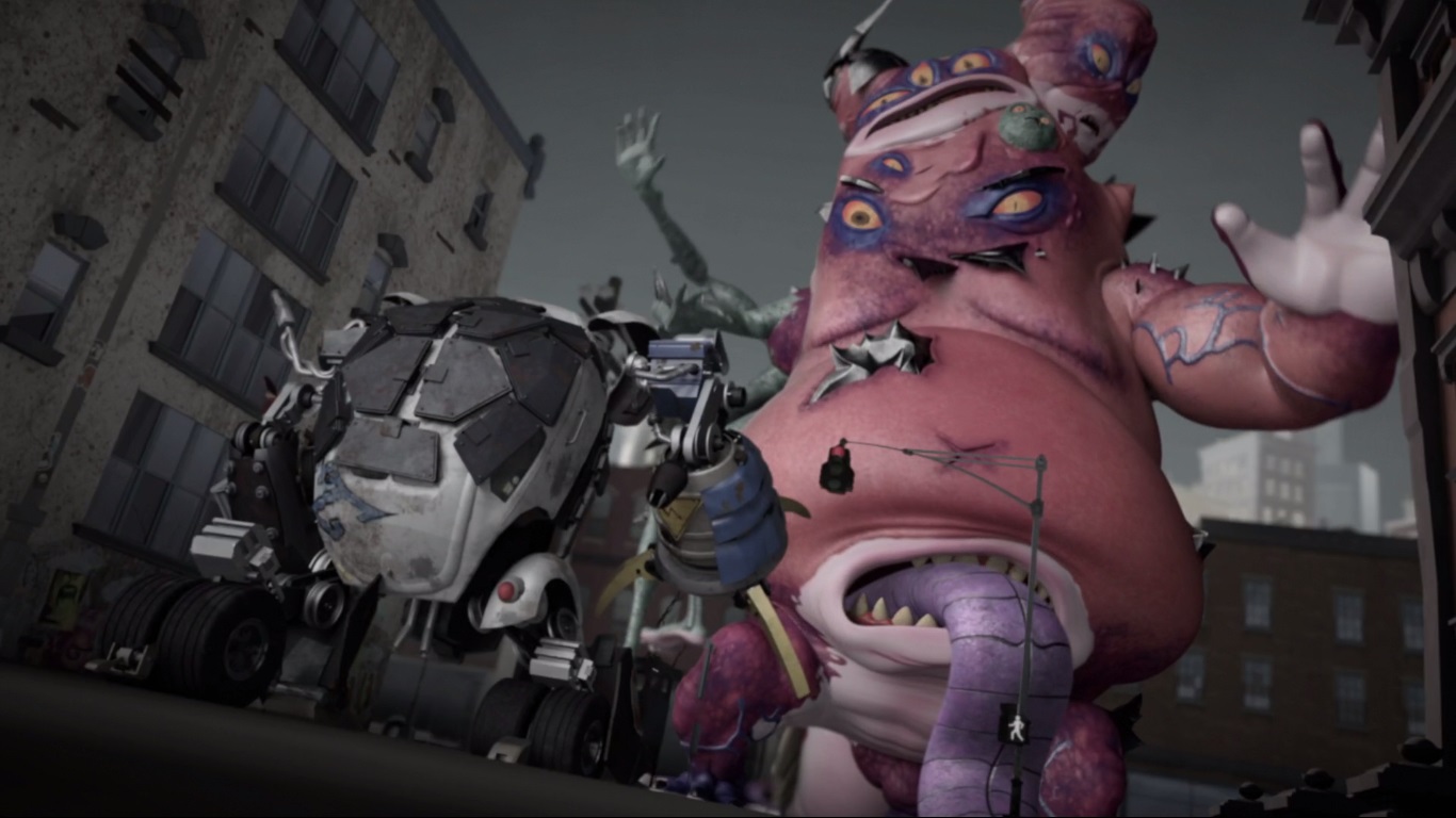 Dans les rues de New York, Leonardo et Michelangelo étaient stupéfaits de ce qu’ils voyaient. Le mutant sorti de la cuve était un Méga Shredder, une créature hybride, fusion des trois mutants crustacés. Quelque chose de difforme, possédant de multiples bras, de multiples bouches, et de multiples yeux. Quelque chose de plusieurs dizaines de mètres de haut qui terrorisait la ville entière.