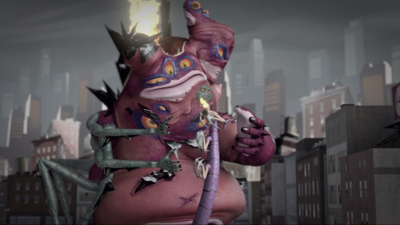 finalement Michelangelo qui les sauva. Les dents de la créature volèrent en morceaux, laissant la proie sortir de sa bouche. Dans un saut périlleux, Michelangelo trancha la langue, qui vola sur l’asphalte de la rue avant de mourir.