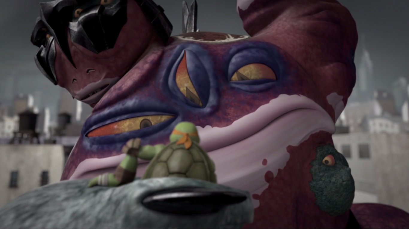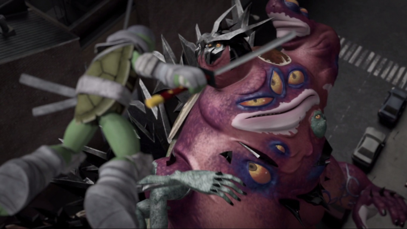 Les deux tortues cherchaient à arrêter le monstre à l’aide de leur grappin, filant entre les immeubles et sautant sur le monstre. La créature était trop grande et insensible à leurs coups. Michelangelo, trop imprudent, se faisait capturer dans les airs. La créature le mangeait sous les yeux de Leonardo, terrifié.