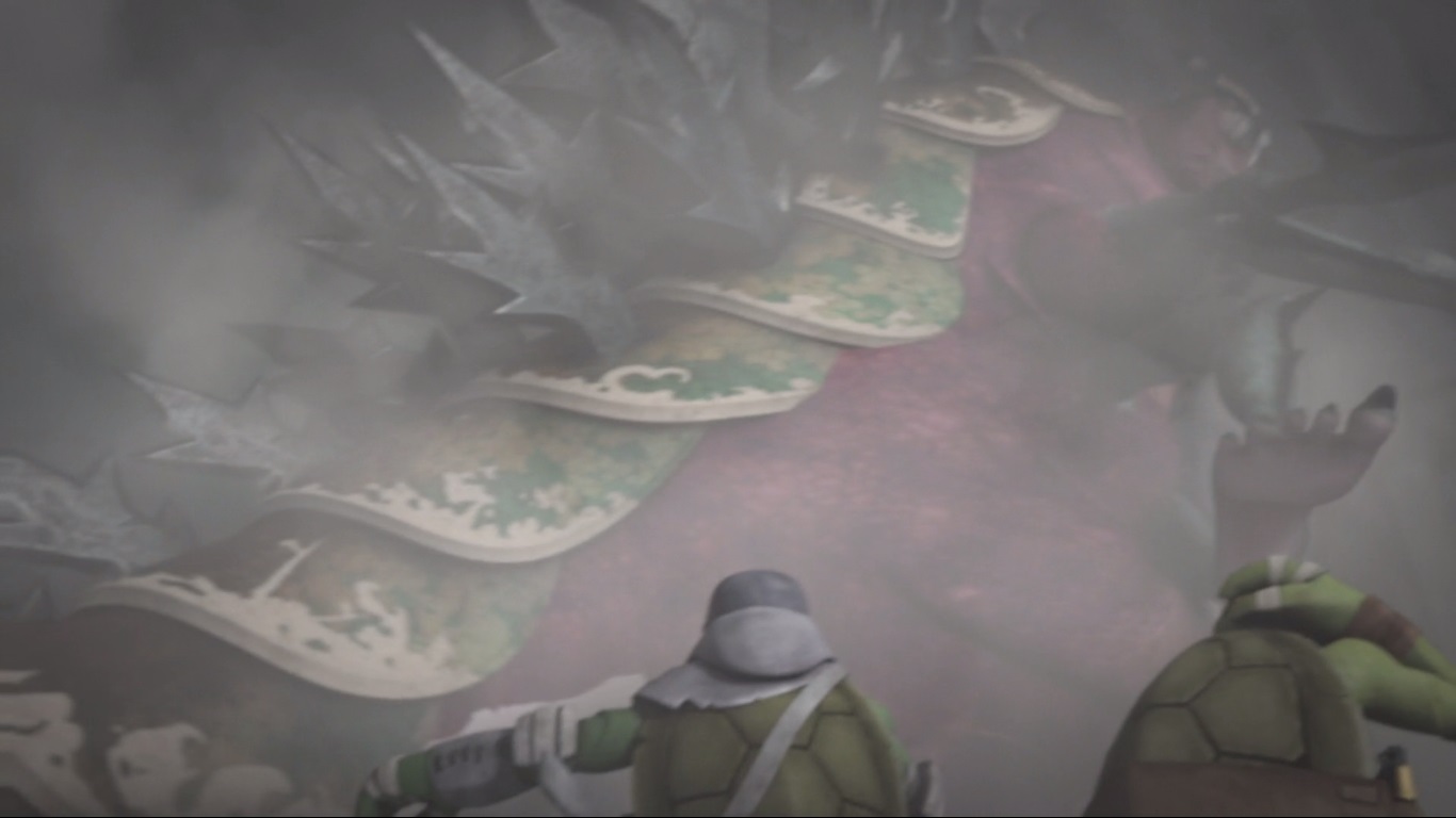 À l’extérieur, le Turtle Mech tentait tant bien que mal de se défaire du monstre qui l’attaquait avec sa langue principale, faite d’un clone d’Oroku Saki. Donatello déduisait, au vu de son comportement, que ce clone était le cerveau du monstre. Ils devaient porter leurs attaques à son égard. Leonardo essayait d’intervenir aussi pour aider ses amis. C’est