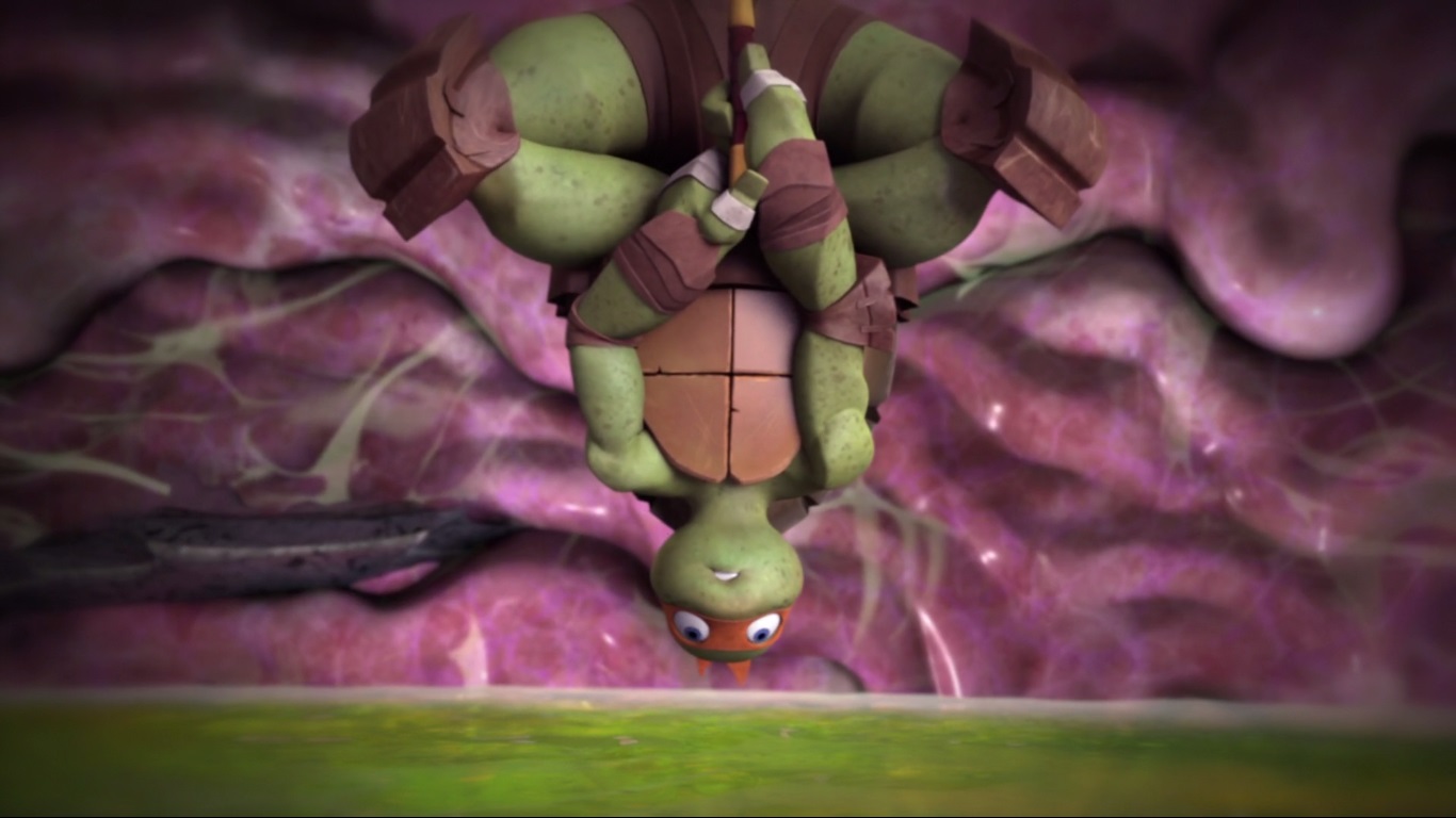 Parallèlement, Michelangelo n’était pas mort dévoré. Il tentait par tous les diables de ne pas tomber dans les sucs gastriques du monstre. Pire encore, un ver géant rôdait dans cette substance corrosive et il cherchait à l’attraper. Le combat entre le robot et le Méga Shredder provoquait des secousses incessantes. La tortue tombait à proximité d’un lac gastrique et se faisait prendre par le ver qui commençait à s’enrouler autour de lui. Le ninja parvenait à s’en défaire, le coupant en deux de son kusarigama, avant de tenter de sortir de là.