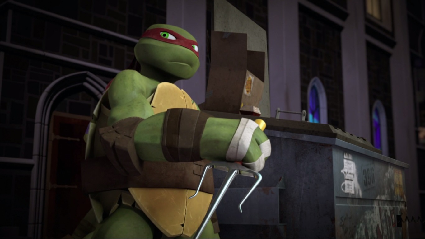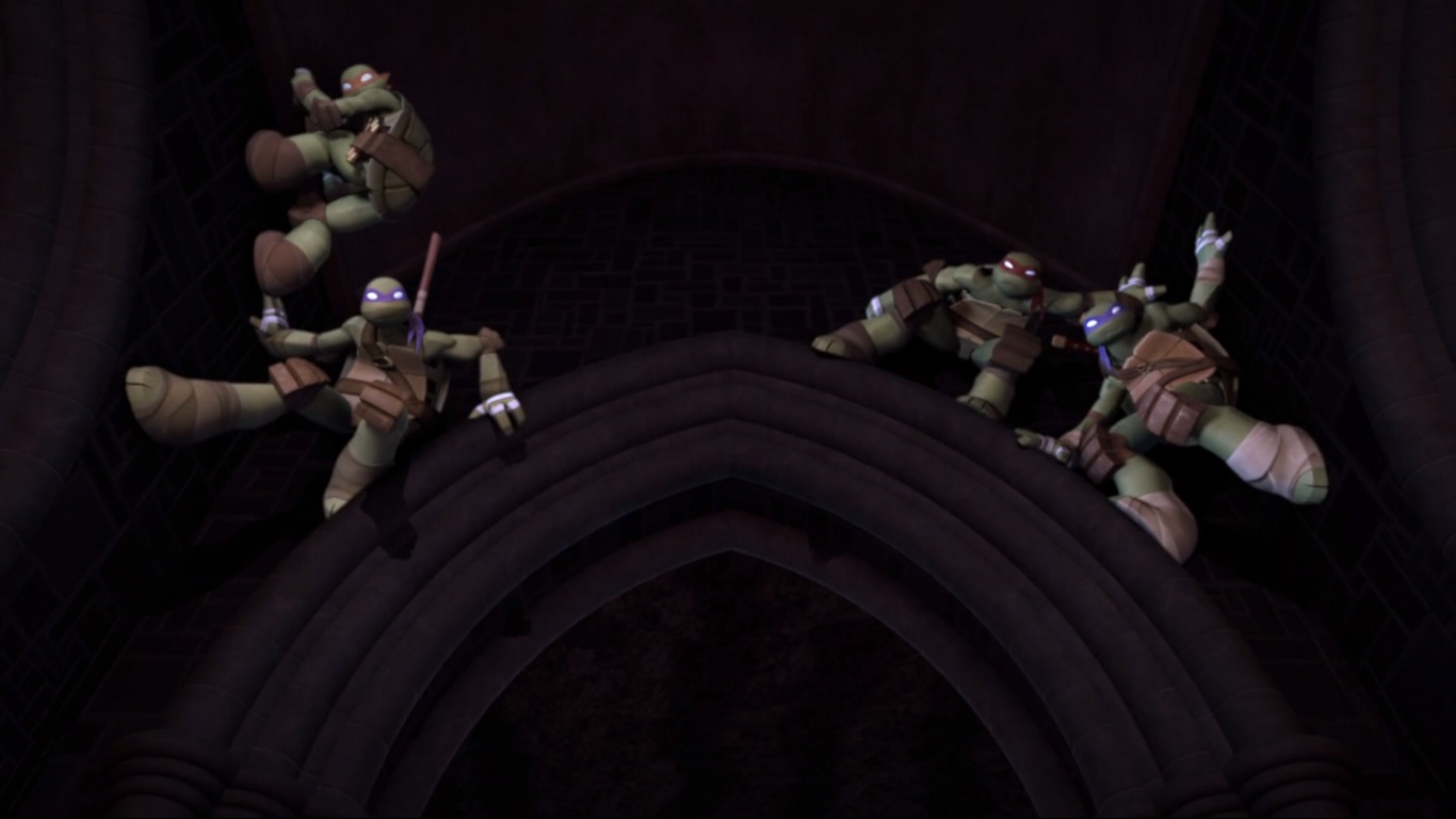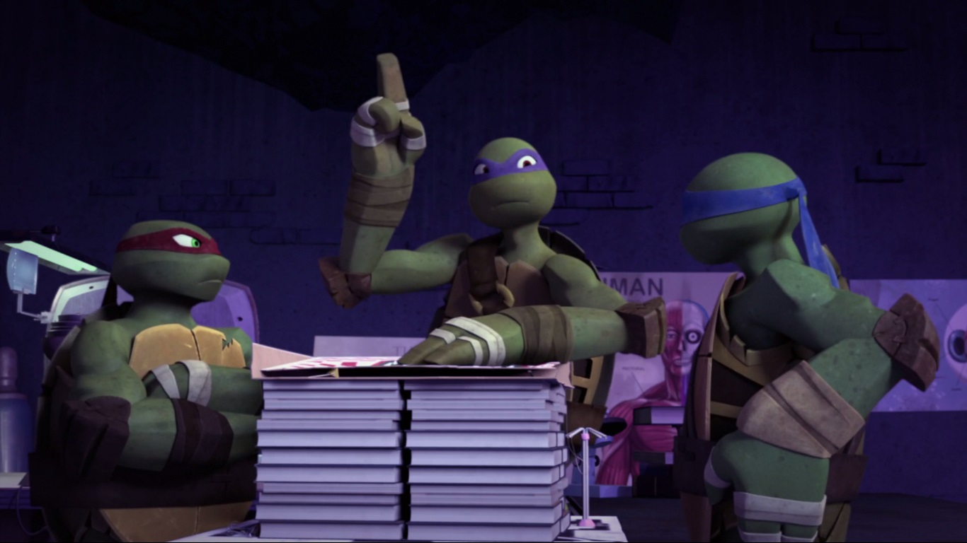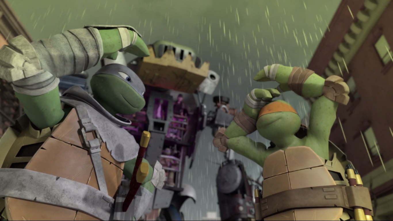 Dans les égouts, Casey venait d’arriver pour renforcer l’équipe, mais Splinter s’opposait toujours à leur intervention. Cependant, un flash d’information le faisait très vite changer d’avis. Face à un Raphael toujours blessé, Donatello optait pour ressortir une de ses inventions du placard.