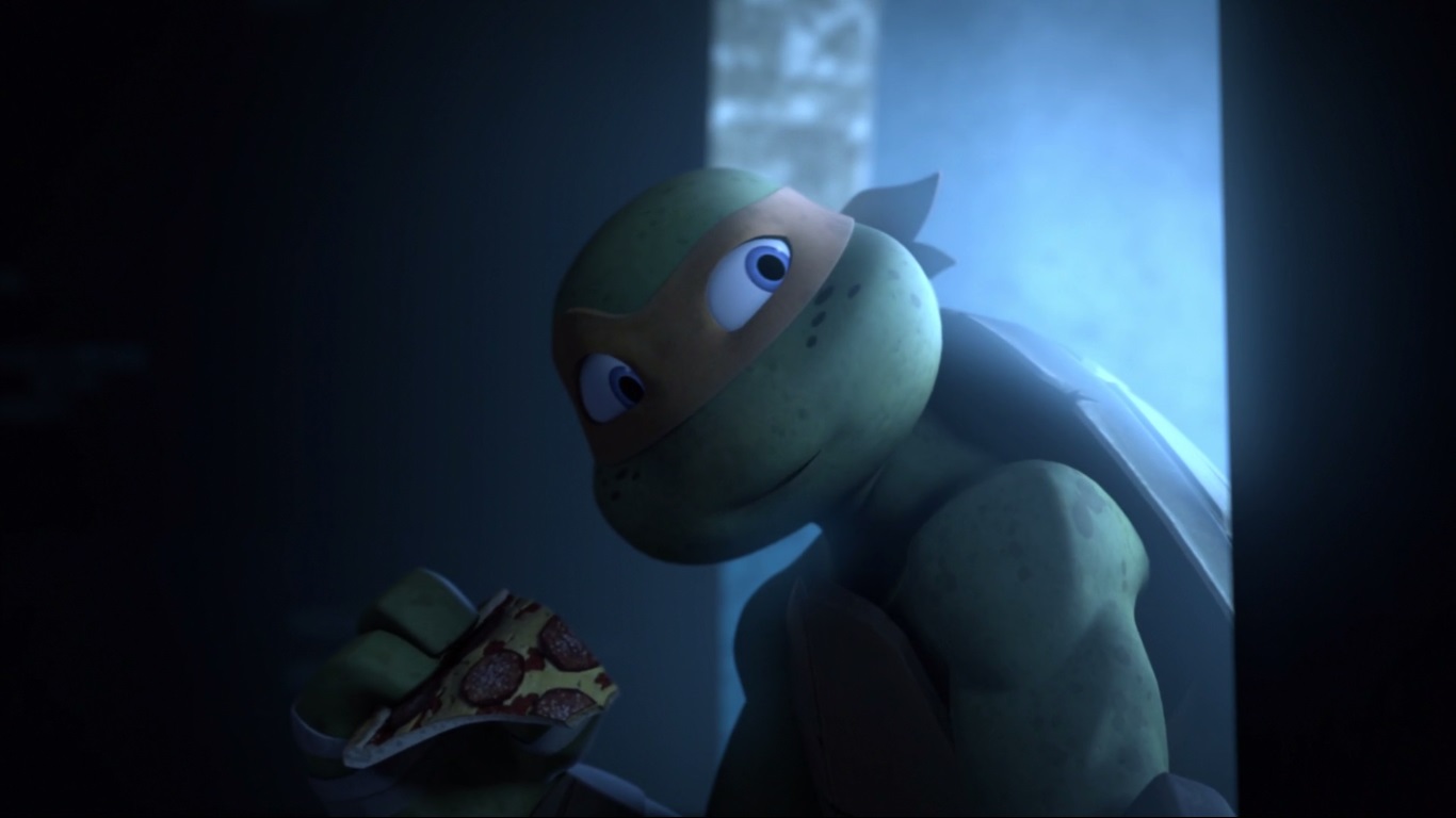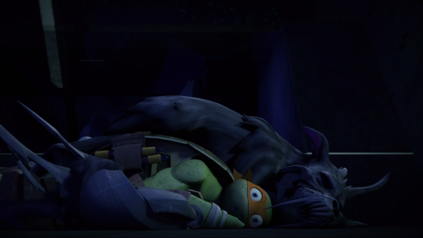 Les deux frères entraient par la salle principale de la demeure de Shredder. Hélas, la discrétion n’était clairement pas le fort de Michelangelo, dont l’œil était attiré par un Fishface profondément endormit. Il trébuchait sur Rahzar, qui trop occupé par ses rêves, prenait la tortue au sol comme un ours en peluche et le serrait fort contre lui.