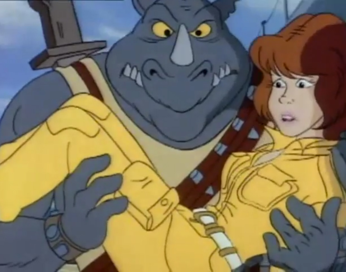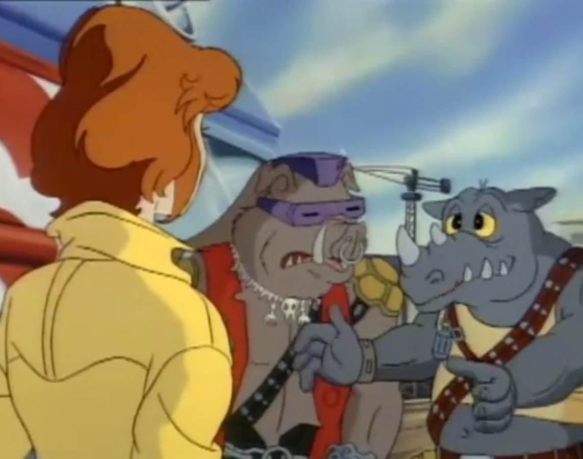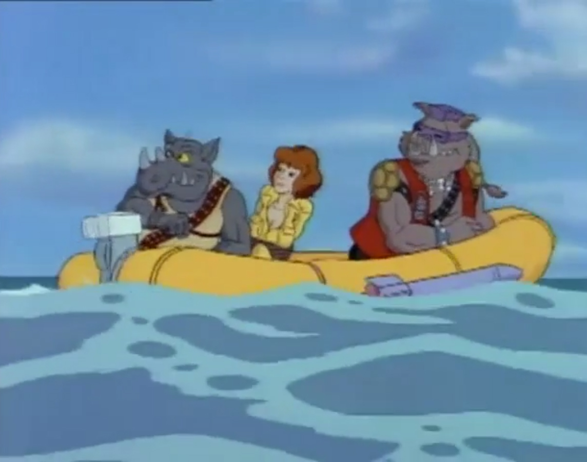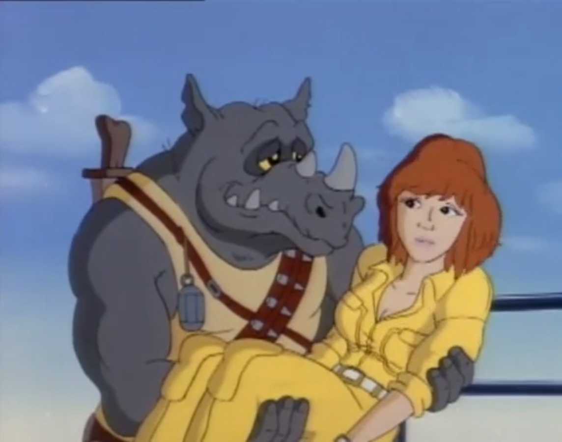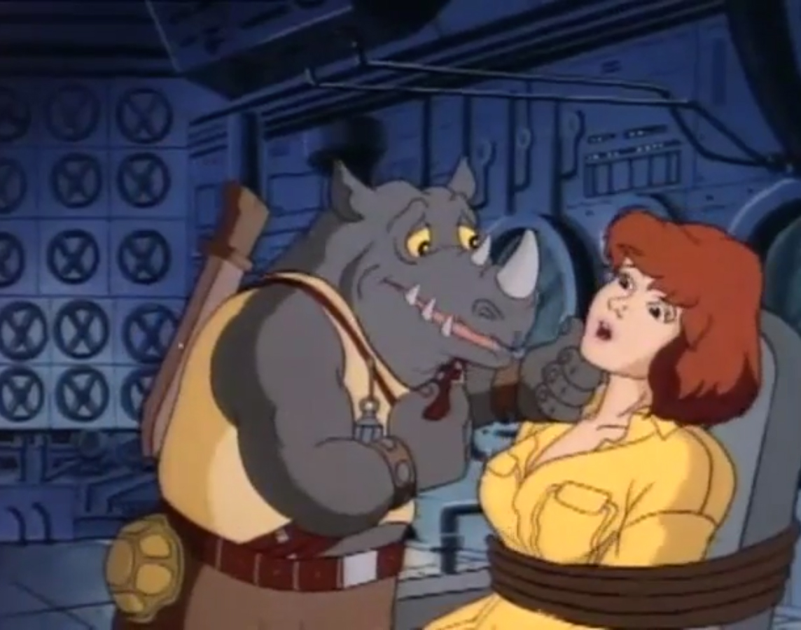Bebop et Rocksteady repartaient pour la surface à bord d’un module. Le rhinocéros trouvait le temps long et mangeait une part de pizza. Une part contaminée par le filtre d’amour… persuadé que son cœur était de pierre, il doutait que le filtre ait de l’effet sur lui. Arrivés à la surface, ils trouvaient April. Rocksteady tombait immédiatement sous son charme de la jeune femme et la capturait. Pire encore, le tortuecom’ de la journaliste tombait au sol. Elle ne pourrait pas appeler ses amis. Il l’emmenait dans le sous-marin pour être tranquille. Le rhinocéros l’attachait à une chaise. Bebop comptait se servir d’elle comme un appât pour éliminer les tortues. Pendant ce temps, Rocksteady faisait des plans sur la comète concernant son avenir avec April. La journaliste le repoussait jusqu’à se rendre compte qu’elle aurait besoin de lui pour récupérer son tortuecom’. Lui faisant du charme, elle lui demandait son « poudrier », espérant qu’il ne comprenne pas de quoi il s’agissait. Très serviable, le voyou le lui rapportait. Une fois en main, elle s’empressait d’avertir ses amis. Donatello venait justement de terminer l’antidote pour ses frères. Et pour Rocksteady qui en pinçait un petit peu trop pour elle. La tortue déposait son anti-filtre d’amour sur une pizza pour attirer les autres tortues. Mais trop amoureuses, elles n’avaient pas faim… Splinter dut ruser en précisant que cette pizza avait été confectionnée par Irma en personne ! Le piège fonctionnait les trois tortues se jetaient dessus.