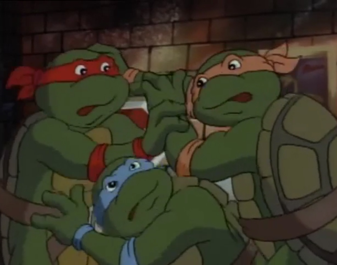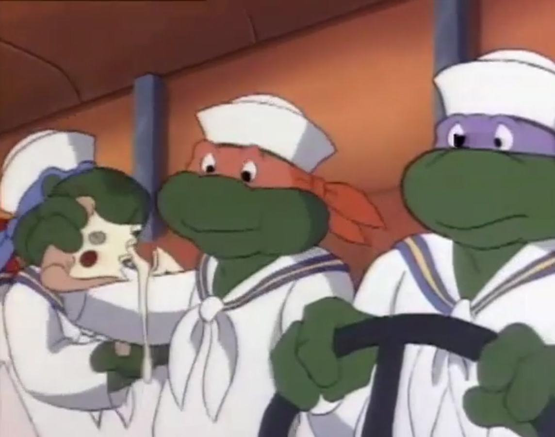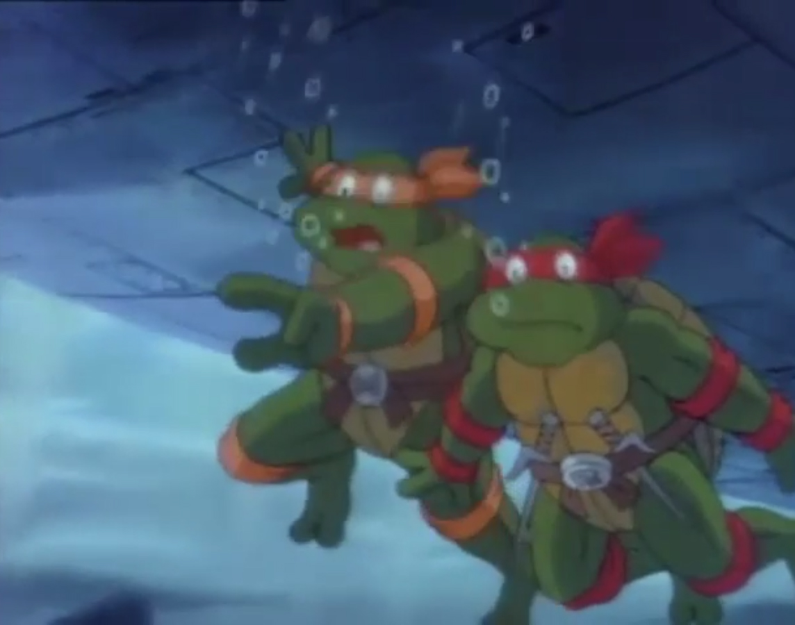 Au même moment, un module traversait le sable des fonds marins. Deux soldats Foot en sortaient pour brancher des pinces crocodile sur la réserve nucléaire. Activant l’appareil, Krang parvenait à pomper l’énergie du sous-marin. L’extraterrestre apportait au même moment un flacon d’une essence rouge. Un filtre d’amour qu’il réservait aux tortues pour ne pas qu’elles les embêtent durant l’opération. Bebop et Rocksteady étaient chargés de déverser la « potion » sur des pizzas. Heureusement pour eux, les tortues s’arrêtaient justement devant cette pizzeria en route, avant d’aller au cinéma.