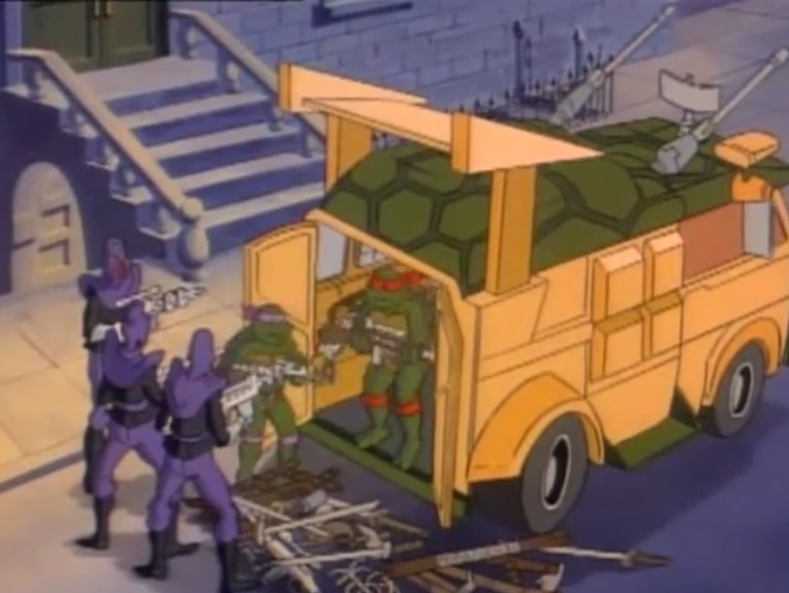 Cela ne pouvait que fonctionner ! Les tortues arrivaient immédiatement à bord de leur Turtle van. Shredder prenait une camionnette, que les reptiles suivaient jusqu’au pied de l’immeuble de Lotus. Krang se réjouissait de les voir arriver et menaçait de jeter Splinter d’une fenêtre. Sans autre choix, les tortues jetaient leurs armes au sol. Leonardo comptait faire le tour pour passer par derrière le bâtiment.