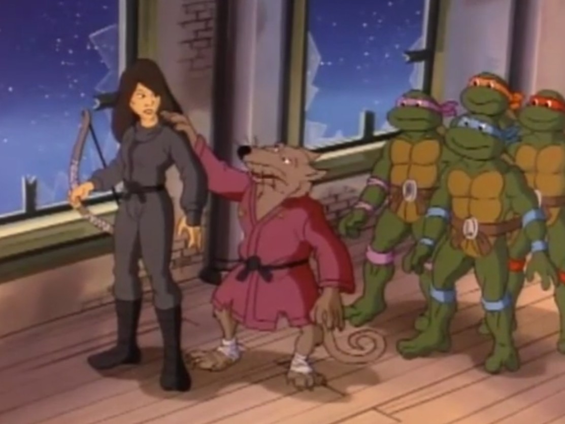 April se rendait dans le repaire des tortues avec un lotus en main pour demander de l’aide aux tortues dans son enquête. Deux infractions, et deux lotus laissés sur les lieux du crime. Le professeur de l’aquarium avait pu donner plus d’informations sur sa ravisseuse. Cela n’était pas sans rappeler une vieille histoire à Splinter. Au Japon, une jeune fille avait très rapidement dépassé ses maîtres dans les arts martiaux. Il n’avait pas eu le temps de donner son nom et de poursuivre ses explications que le mur du repaire s’effondrait. Quelques robots Foot et Lotus pénétraient dans leur salon. Splinter était capturé par un rayon laser. Saisissant sa caméra, April filmait le combat.