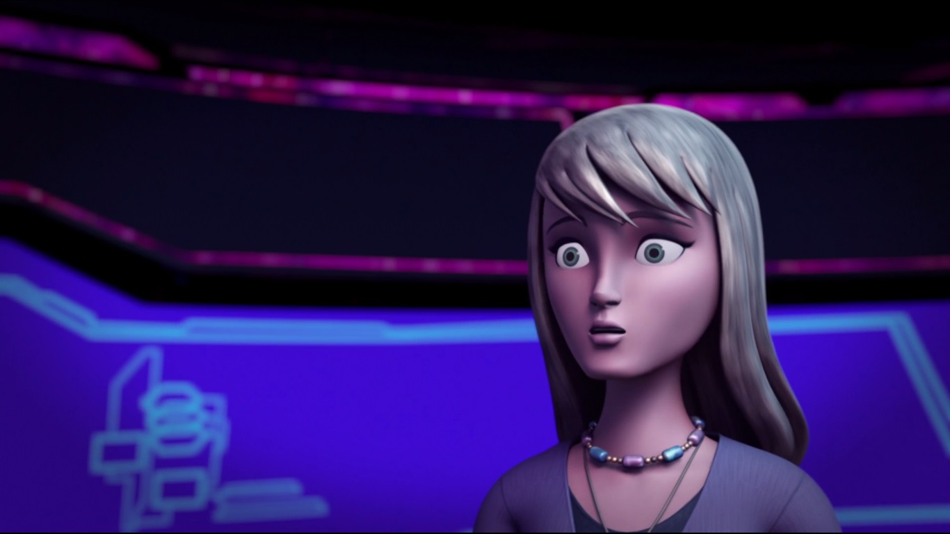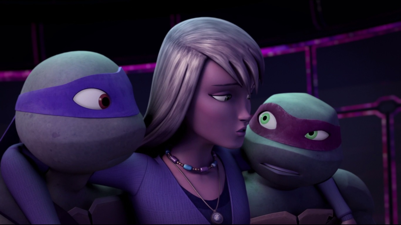 S’aventurant dans l’appareil couvert par plusieurs couches de poussière, les tortues découvraient une sorte de caisson transparent, où une figure humanoïde se dessinait à l’intérieur. Donatello était d’avis à ce que personne ne touche quoi que ce soit, en particulier Michelangelo. Mais la tortue très maladroite activa un bouton de son coude. La porte du caisson s’ouvrit et une femme en sortit. Raphael et Donatello la voyant faible et titubante, se précipitaient pour l’aider à en sortir. Affaiblie, elle s’évanouit.