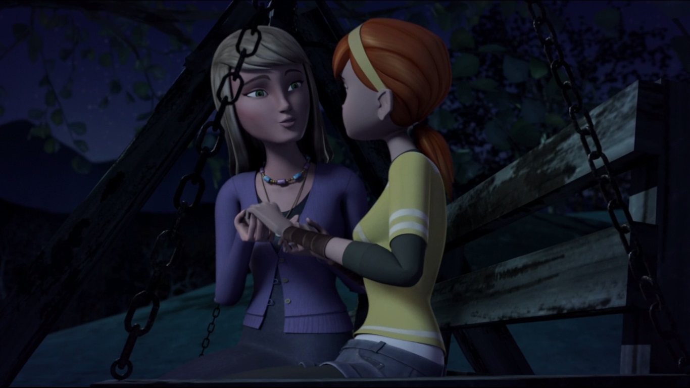 Saison 3 épisode 3 - Buried secretsLa mère d’April était restée à l’extérieur, observant les bois. Sa fille la rejoignait, désolée de ce qu’il venait de se passer. Elle refusait de quitter les tortues, malgré les supplications de sa mère.