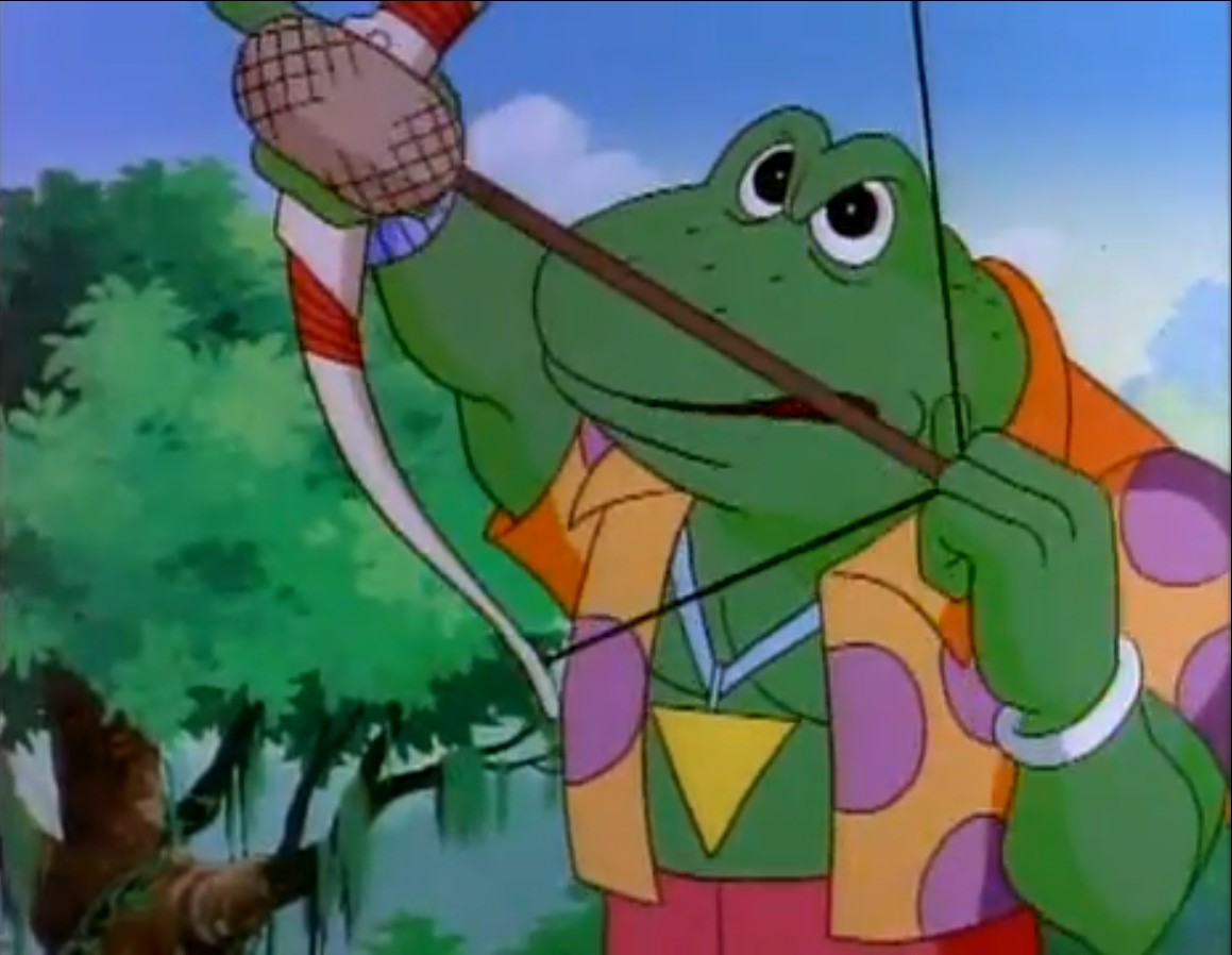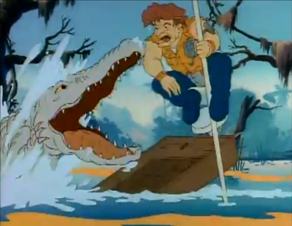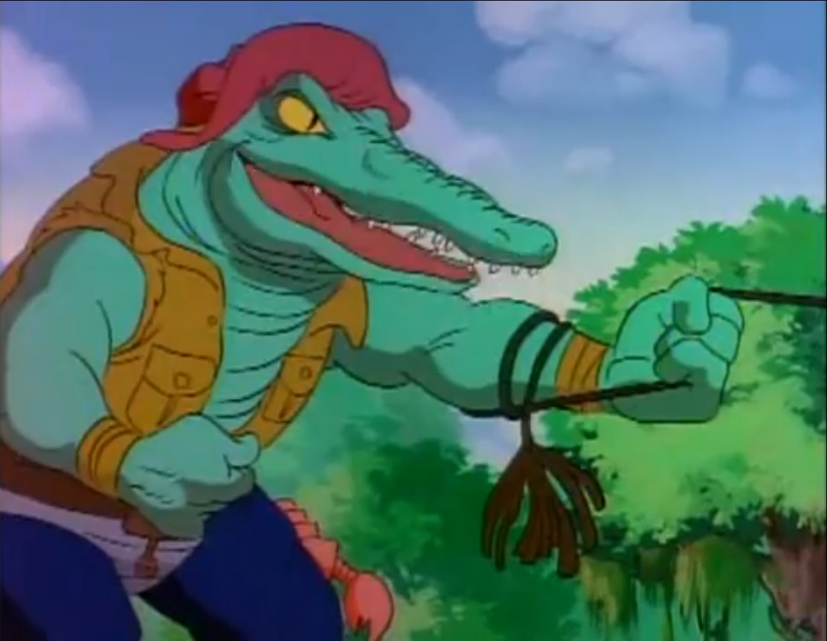 Progressant dans le lieu sauvage, les cinq amis se firent capturer dans un filet dissimulé dans le sol, rattaché à une branche d’arbre. L’alligator mutant, alerté par le bruit, s’avançait vers ses nouvelles prises. Personne n’avait le droit de pénétrer dans son domaine ! Genghis voyant leurs amis capturés, lança sa hache sur la corde qui maintenait le filet. Les cinq compagnons étaient tombés sur Leatherhead, qui ne pouvait plus bouger. Leonardo attachait solidement le reptile tandis que les grenouilles saluaient les visiteurs.