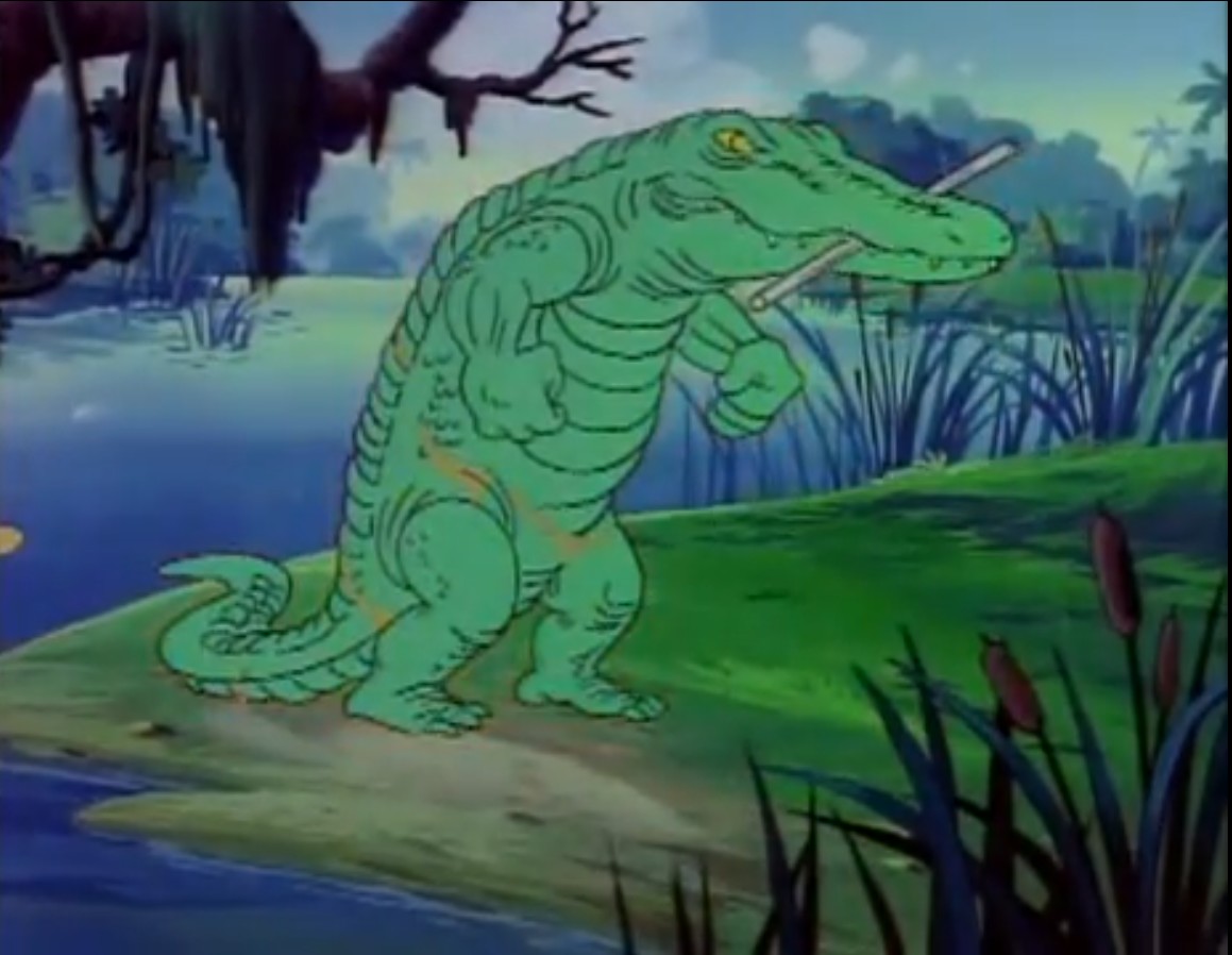 Cependant, lorsqu’il regagne le rivage, Leatherhead est montré de couleur verte, comme un alligator normal. Une fois transformé, il possède même les vêtements de son braconnier, sans la moindre explication !- S’agissait-il réellement d’un alligator albinos ? Ces reptiles ne peuvent vivre plus d’une journée en milieu naturel (source).