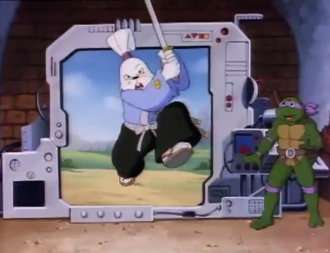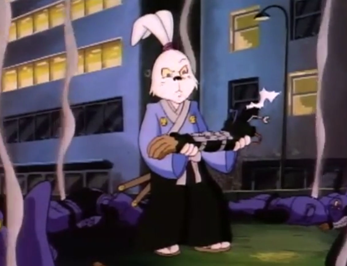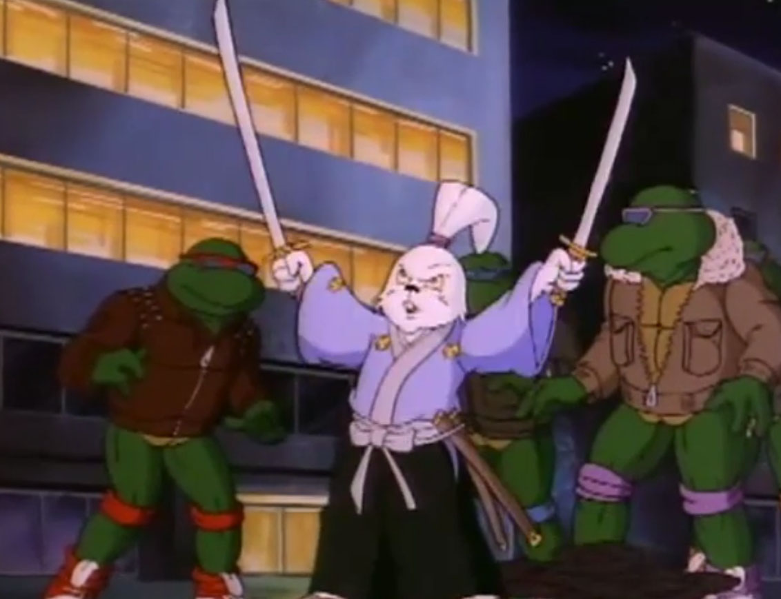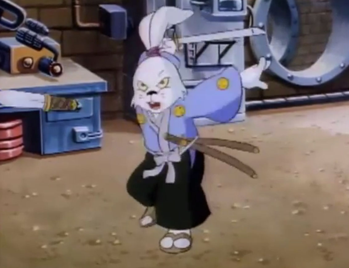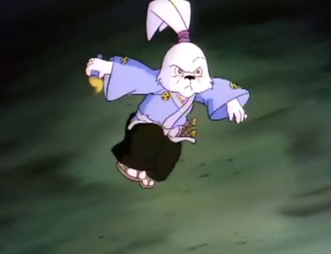 Ils y voyaient un lapin muni d’un sabre, s’opposant à trois cochons en armures de samurai. Ces derniers étaient mis en déroute sans mal par leur adversaire aux longues oreilles. Voyant un portail s’ouvrir face à lui, il le traversait, arrivant dans le laboratoire de Donatello. Il s’imaginait que les tortues avaient été envoyées par le fils du shogun pour le tuer. Impossible de mettre la main sur le lapin, bien trop adroit au sabre. Il gagnait contre chaque tortue, hormis Leonardo qui lui proposait un très beau duel. Mais sa lame était de moins bonne qualité et cédait face à un guerrier expérimenté. C’est alors que Michaelangelo fit irruption dans la pièce, pizza à la main, qu’il lui envoyait au visage. C’était l’arme idéale. Le lapin était conquis par son goût.
