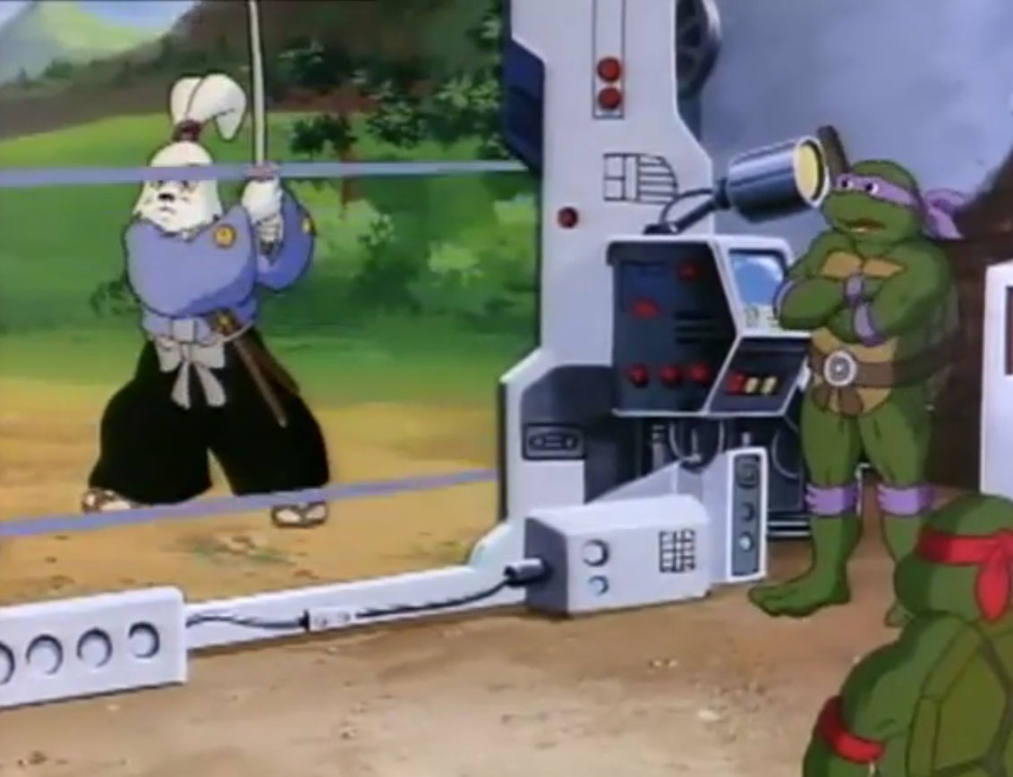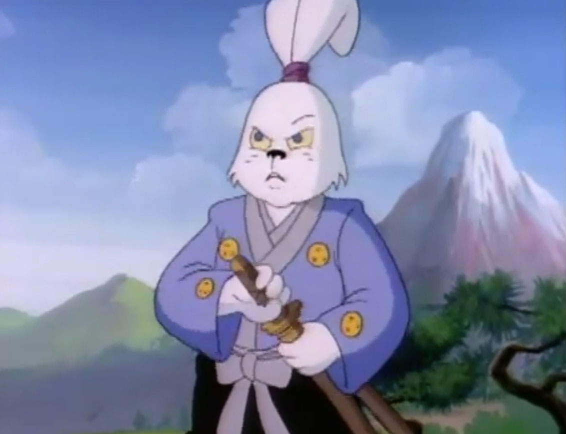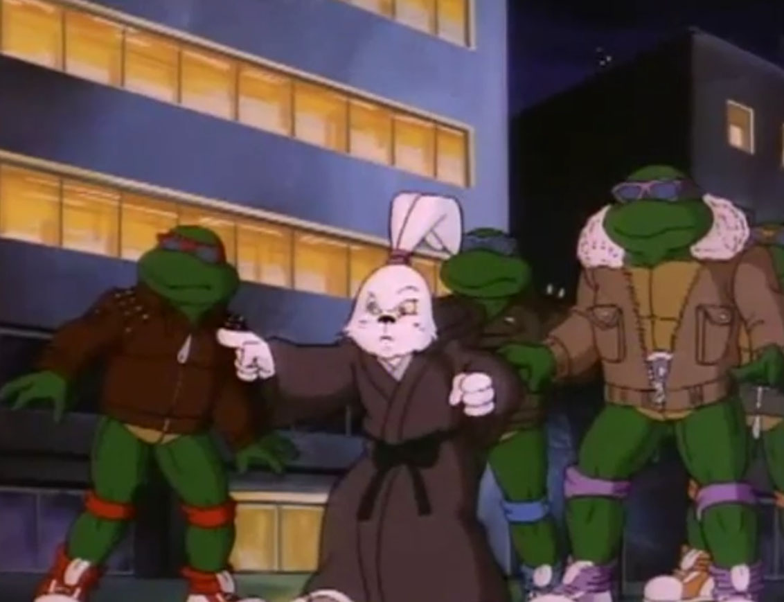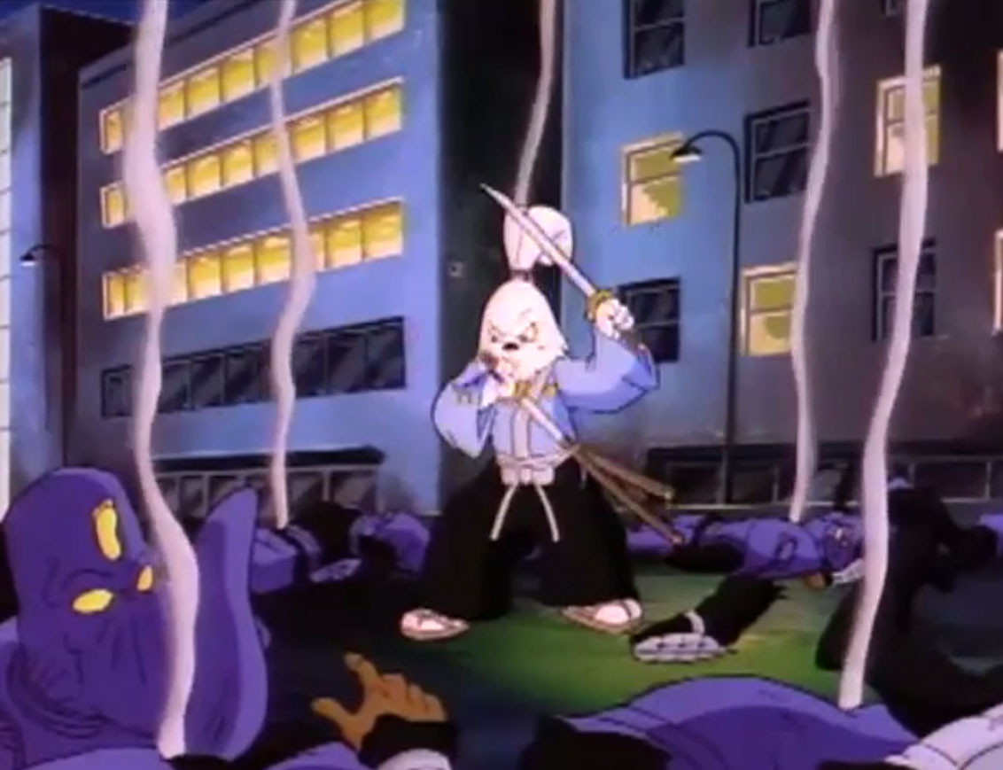 Ils y voyaient un lapin muni d’un sabre, s’opposant à trois cochons en armures de samurai. Ces derniers étaient mis en déroute sans mal par leur adversaire aux longues oreilles. Voyant un portail s’ouvrir face à lui, il le traversait, arrivant dans le laboratoire de Donatello. Il s’imaginait que les tortues avaient été envoyées par le fils du shogun pour le tuer. Impossible de mettre la main sur le lapin, bien trop adroit au sabre. Il gagnait contre chaque tortue, hormis Leonardo qui lui proposait un très beau duel. Mais sa lame était de moins bonne qualité et cédait face à un guerrier expérimenté. C’est alors que Michaelangelo fit irruption dans la pièce, pizza à la main, qu’il lui envoyait au visage. C’était l’arme idéale. Le lapin était conquis par son goût.
