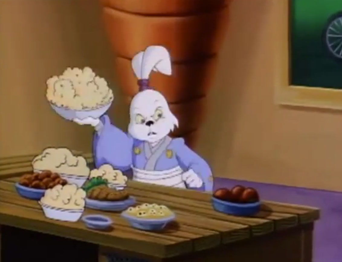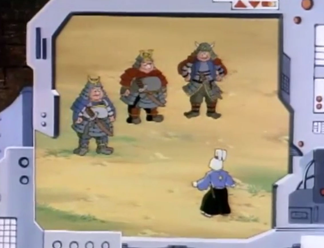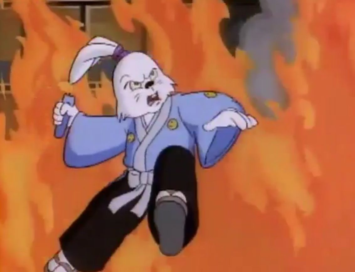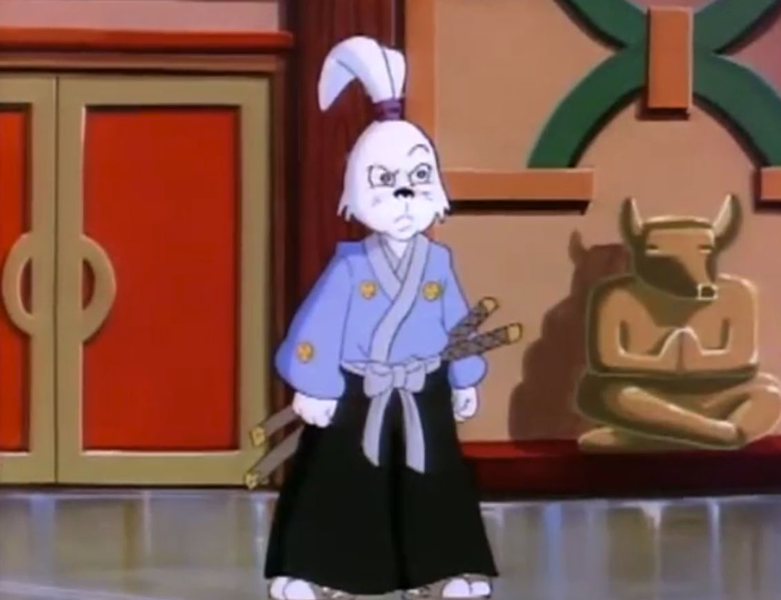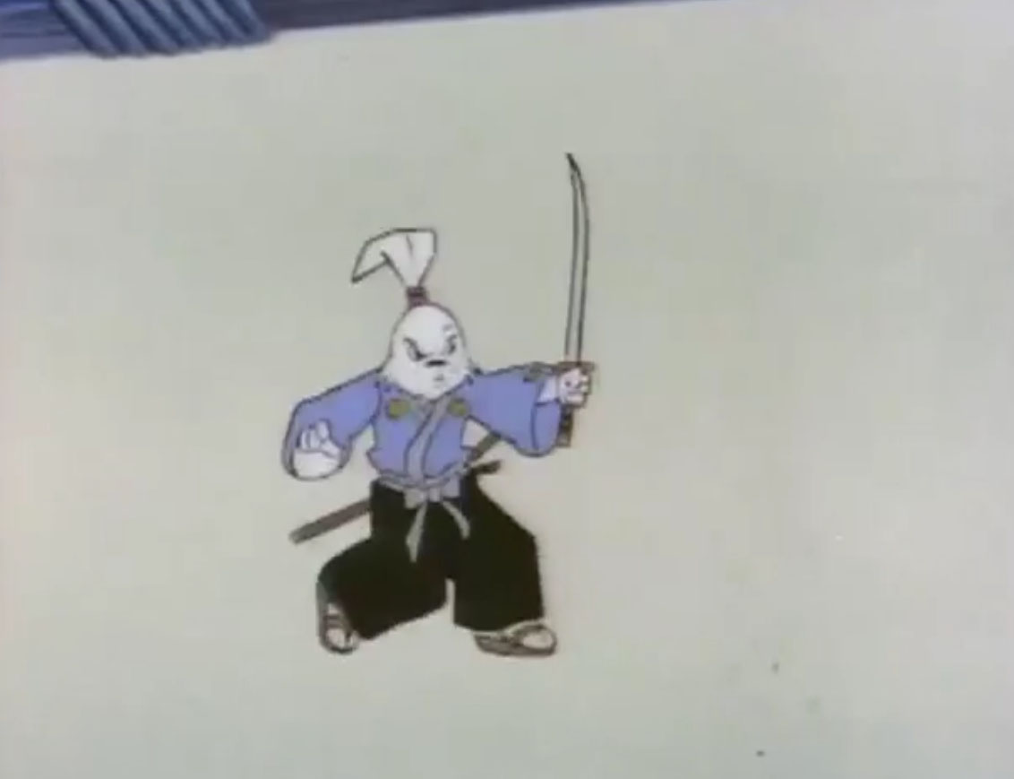 Ils y voyaient un lapin muni d’un sabre, s’opposant à trois cochons en armures de samurai. Ces derniers étaient mis en déroute sans mal par leur adversaire aux longues oreilles. Voyant un portail s’ouvrir face à lui, il le traversait, arrivant dans le laboratoire de Donatello. Il s’imaginait que les tortues avaient été envoyées par le fils du shogun pour le tuer. Impossible de mettre la main sur le lapin, bien trop adroit au sabre. Il gagnait contre chaque tortue, hormis Leonardo qui lui proposait un très beau duel. Mais sa lame était de moins bonne qualité et cédait face à un guerrier expérimenté. C’est alors que Michaelangelo fit irruption dans la pièce, pizza à la main, qu’il lui envoyait au visage. C’était l’arme idéale. Le lapin était conquis par son goût.