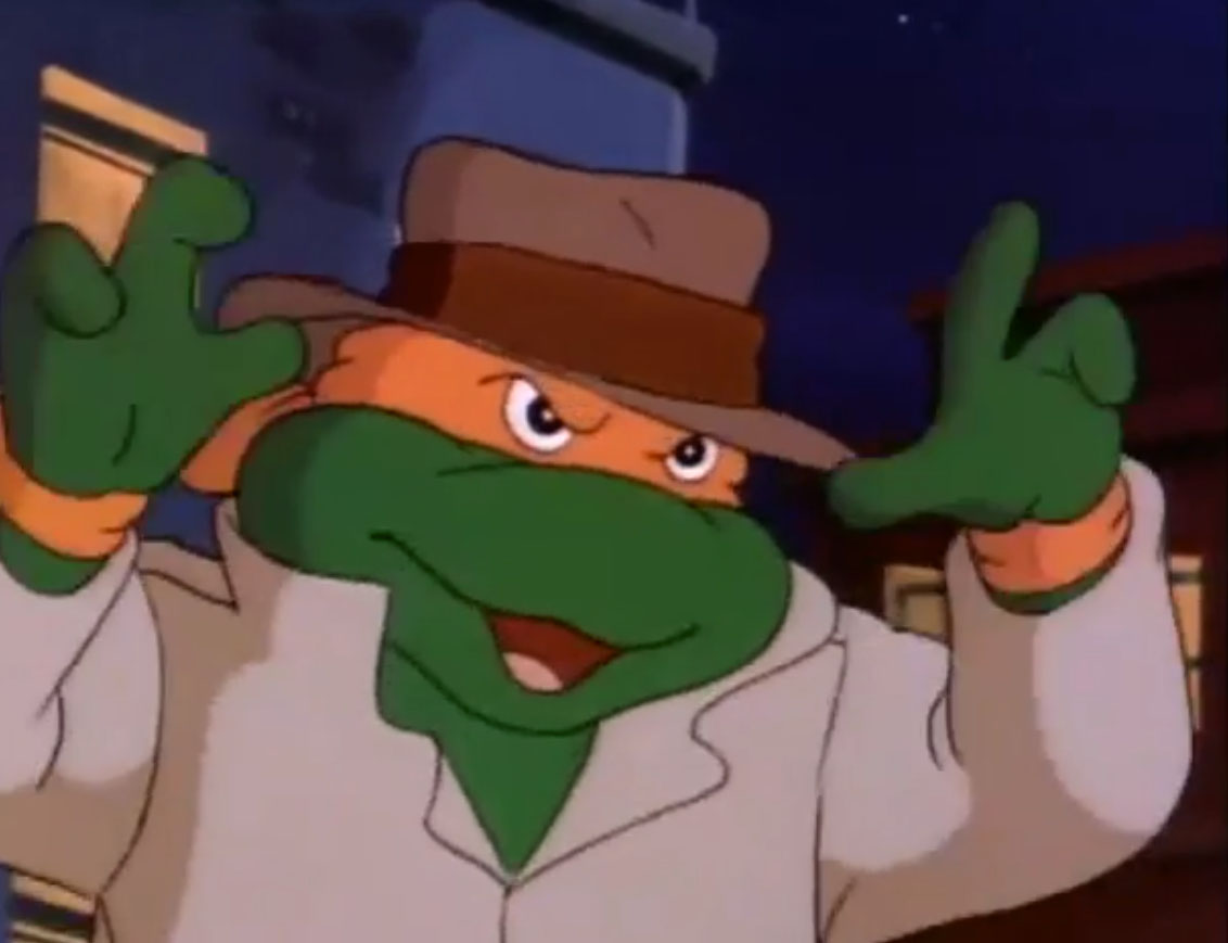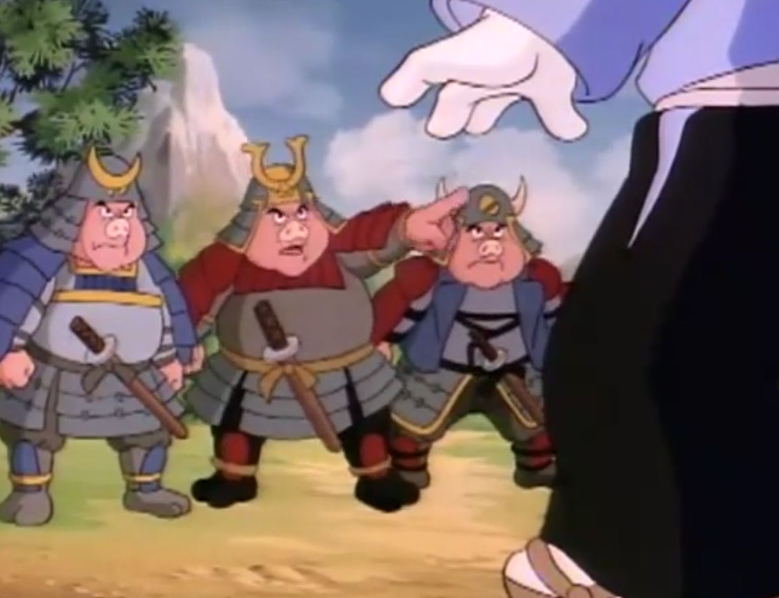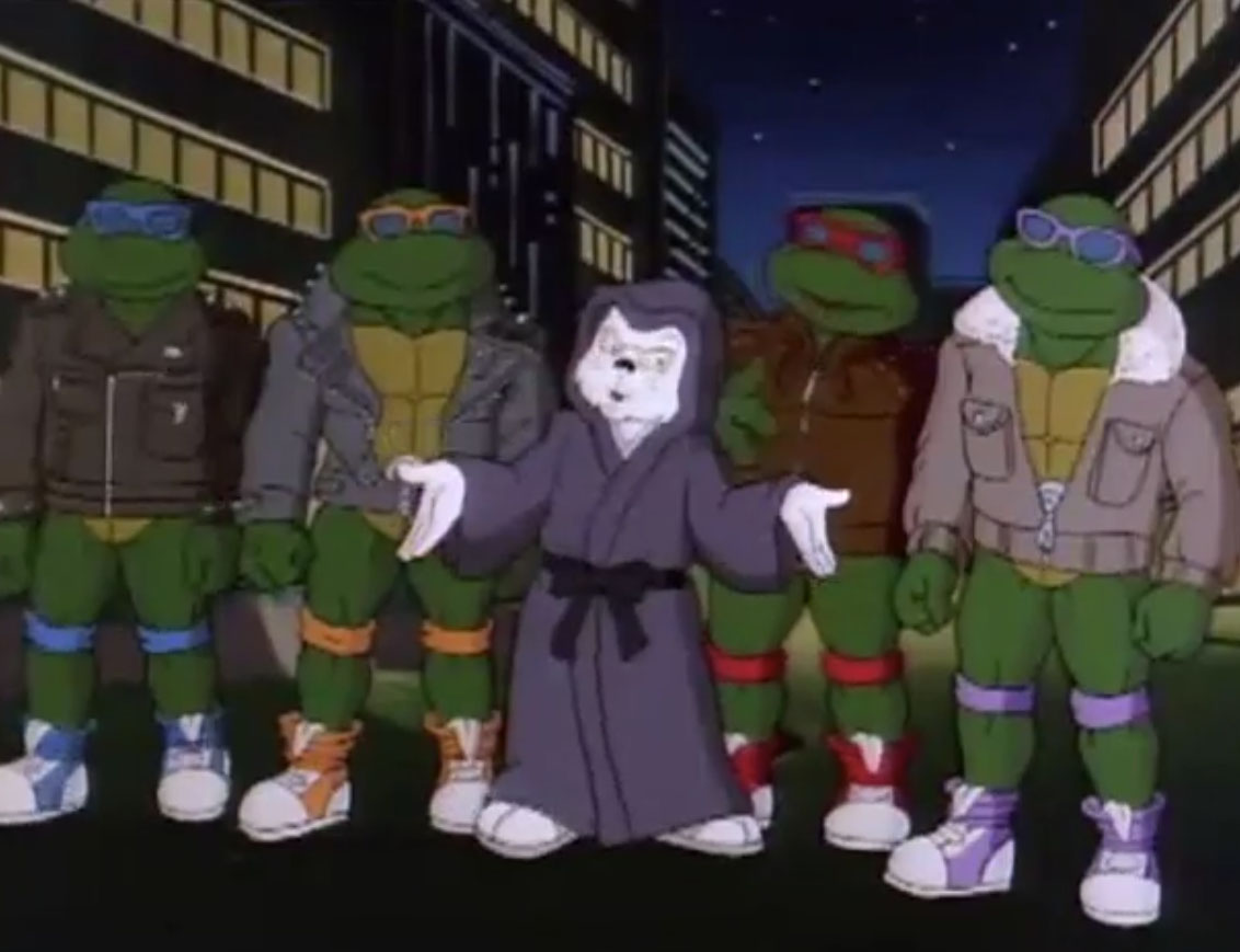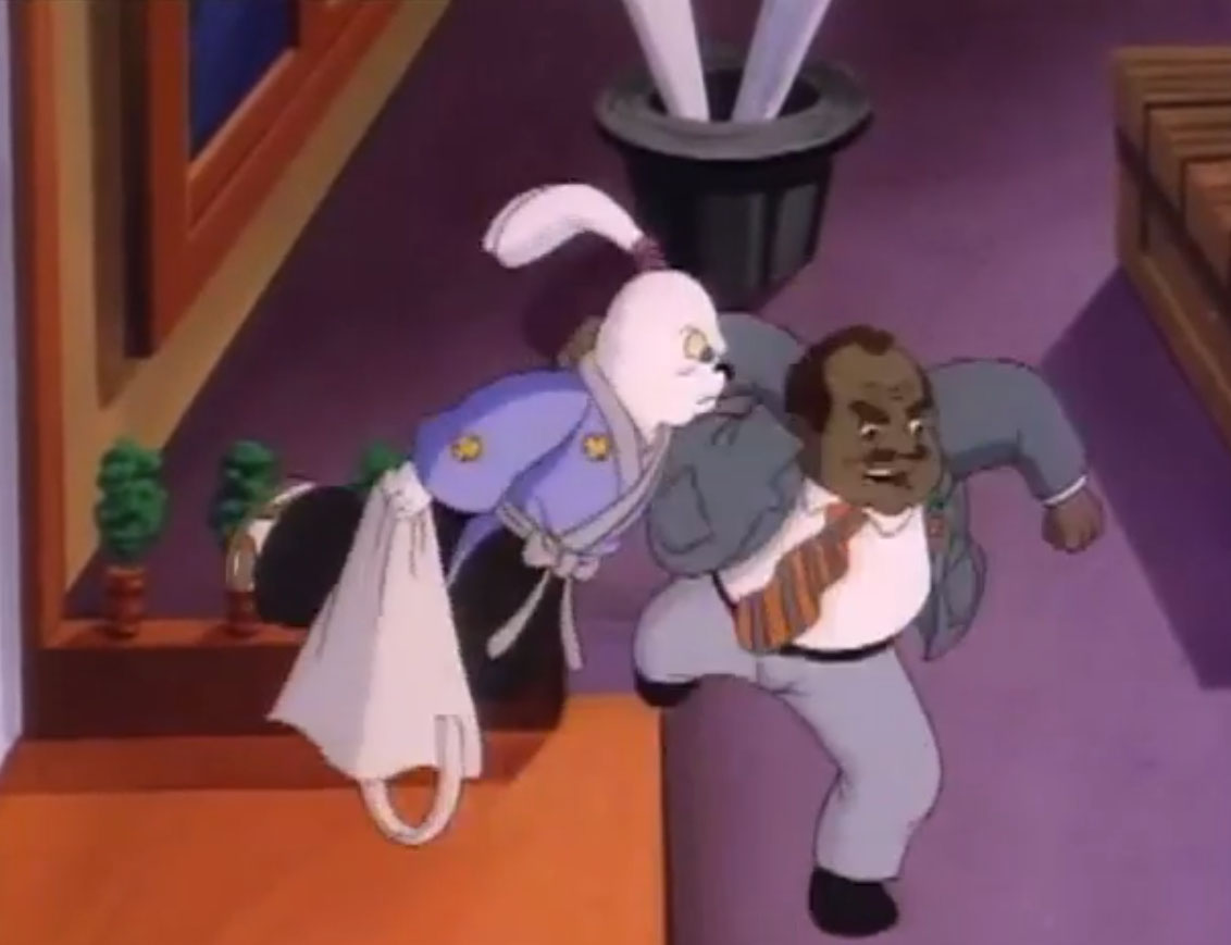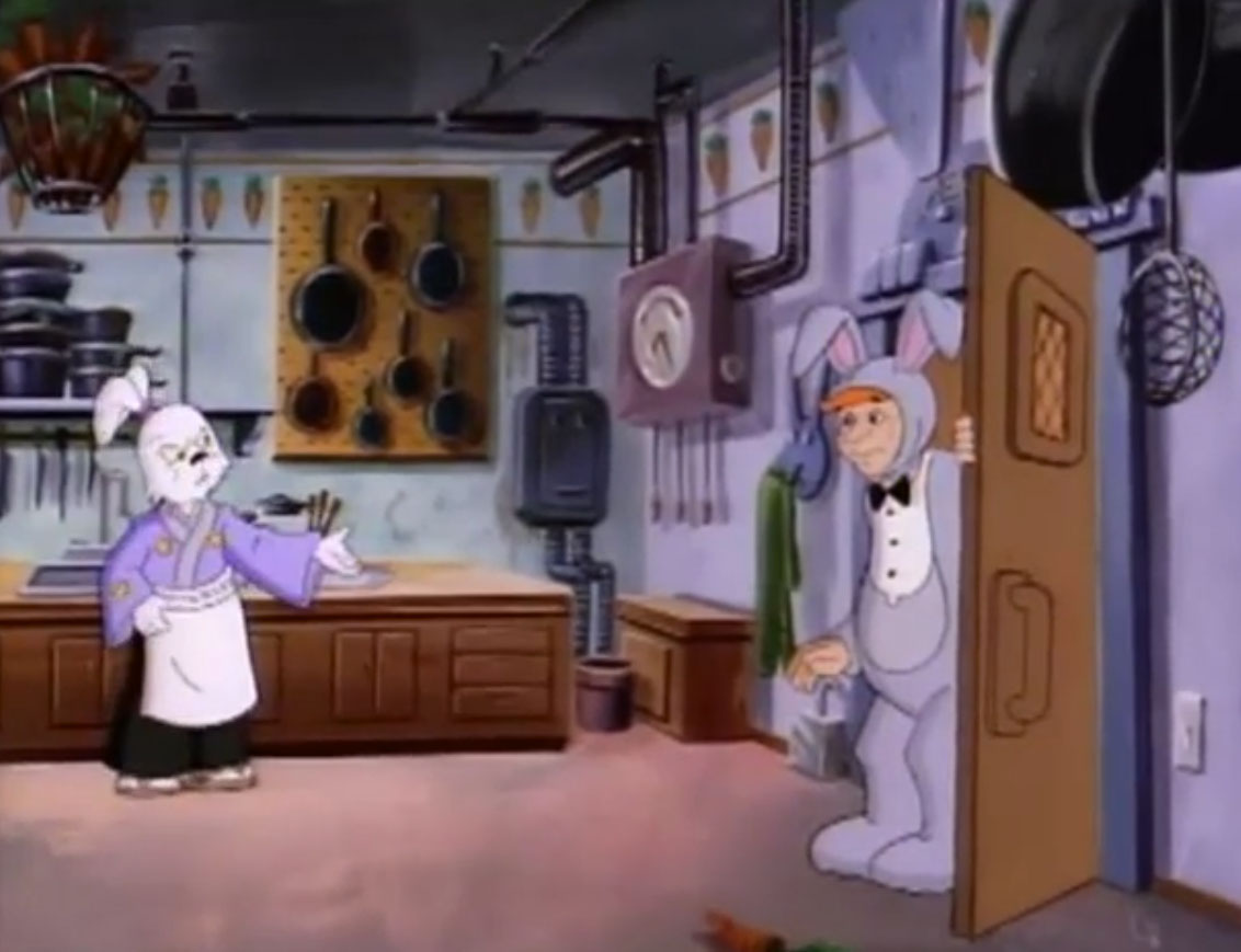 Ils y voyaient un lapin muni d’un sabre, s’opposant à trois cochons en armures de samurai. Ces derniers étaient mis en déroute sans mal par leur adversaire aux longues oreilles. Voyant un portail s’ouvrir face à lui, il le traversait, arrivant dans le laboratoire de Donatello. Il s’imaginait que les tortues avaient été envoyées par le fils du shogun pour le tuer. Impossible de mettre la main sur le lapin, bien trop adroit au sabre. Il gagnait contre chaque tortue, hormis Leonardo qui lui proposait un très beau duel. Mais sa lame était de moins bonne qualité et cédait face à un guerrier expérimenté. C’est alors que Michaelangelo fit irruption dans la pièce, pizza à la main, qu’il lui envoyait au visage. C’était l’arme idéale. Le lapin était conquis par son goût.