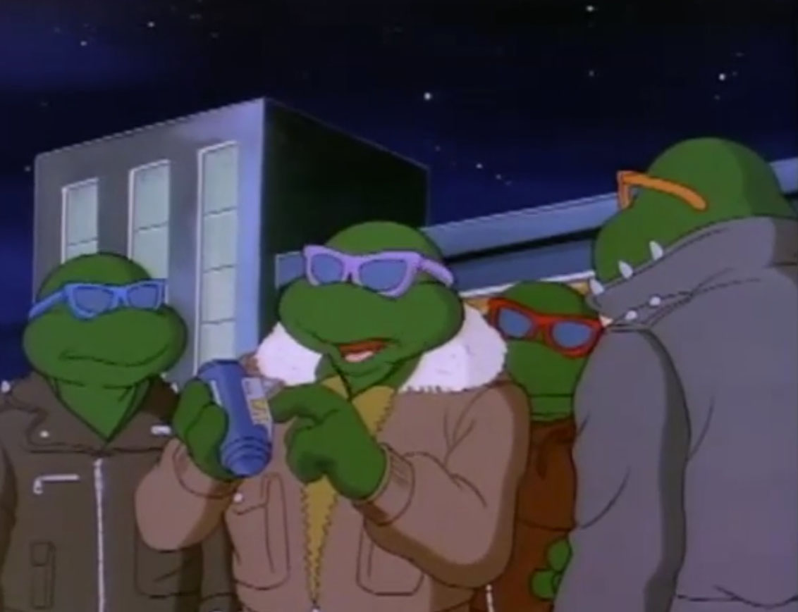 Sortant en ville, les tortues s’étaient déguisées en punks. Usagi revêtait un manteau à capuche noir. Donatello voulait absolument se rendre à Channel 6. Au vu de la violence de l’interférence sur son portail, il se demandait si la chaîne de télévision n’avait pas subi également des dommages sur son matériel. Chemin faisant, Usagi s’arrêtait devant un chamboule tout. Il renversait toutes les conserves d’une fois. Le vendeur, affolé, lui donnait toutes ses peluches et lui demandait de partir.